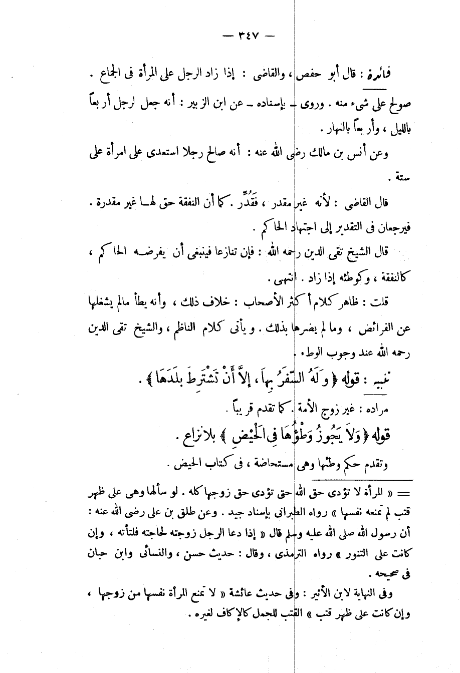 قُلْت: ظَاهِرُ كَلَامِ أَكْثَرِ الْأَصْحَابِ: خِلَافُ ذَلِكَ، وَأَنَّهُ يَطَأُ مَا لَمْ يَشْغَلْهَا عَنْ الْفَرَائِضِ، وَمَا لَمْ يَضُرَّهَا بِذَلِكَ. وَيَأْتِي كَلَامُ النَّاظِمِ، وَالشَّيْخِ تَقِيِّ الدِّينِ - رَحِمَهُ اللَّهُ - عِنْدَ وُجُوبِ الْوَطْءِ.