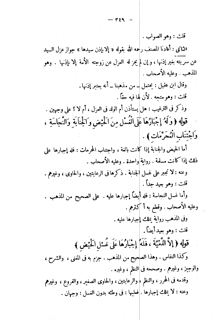 قَوْلُهُ (وَلَهُ إجْبَارُهَا عَلَى الْغُسْلِ مِنْ الْحَيْضِ وَالْجَنَابَةِ وَالنَّجَاسَةِ، وَاجْتِنَابِ الْمُحَرَّمَاتِ) . أَمَّا الْحَيْضُ وَالْجَنَابَةُ إذَا كَانَتْ بَالِغَةً، وَاجْتِنَابُ الْمُحَرَّمَاتِ: فَلَهُ إجْبَارُهَا عَلَى ذَلِكَ إذَا كَانَتْ مُسْلِمَةً. رِوَايَةً وَاحِدَةً. وَعَلَيْهِ الْأَصْحَابُ. وَعَنْهُ: لَا تُجْبَرُ عَلَى غُسْلِ الْجَنَابَةِ. ذَكَرَهَا فِي الرِّعَايَتَيْنِ، وَالْحَاوِي، وَغَيْرِهِمْ. قُلْت: وَهُوَ بَعِيدٌ جِدًّا. وَأَمَّا غَسْلُ النَّجَاسَةِ: فَلَهُ أَيْضًا إجْبَارُهَا عَلَيْهِ. عَلَى الصَّحِيحِ مِنْ الْمَذْهَبِ. وَعَلَيْهِ الْأَصْحَابُ. وَقَطَعَ بِهِ أَكْثَرُهُمْ. وَفِي الْمَذْهَبِ رِوَايَةٌ يَمْلِكُ إجْبَارَهَا عَلَيْهِ. قُلْت: وَهُوَ بَعِيدٌ أَيْضًا. قَوْلُهُ (إلَّا الذِّمِّيَّةَ، فَلَهُ إجْبَارُهَا عَلَى غُسْلِ الْحَيْضِ) وَكَذَا النِّفَاسُ. وَهَذَا الصَّحِيحُ مِنْ الْمَذْهَبِ. جَزَمَ بِهِ فِي الْمُغْنِي، وَالشَّرْحِ، وَالْوَجِيزِ، وَغَيْرِهِمْ. وَصَحَّحَهُ فِي النَّظْمِ، وَغَيْرِهِ. وَقَدَّمَهُ فِي الْمُحَرَّرِ، وَالنَّظْمِ، وَالرِّعَايَتَيْنِ، وَالْحَاوِي الصَّغِيرِ، وَالْفُرُوعِ، وَغَيْرِهِمْ وَعَنْهُ: لَا يَمْلِكُ إجْبَارَهَا. فَعَلَيْهَا: فِي وَطْئِهِ بِدُونِ الْغُسْلِ: وَجْهَانِ.