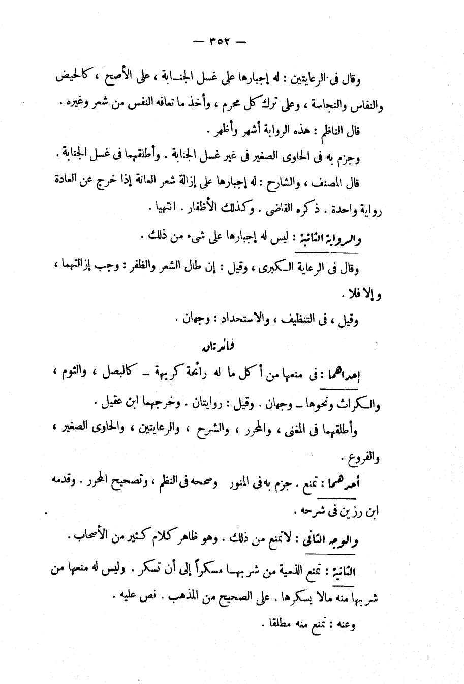 وَقَالَ فِي الرِّعَايَتَيْنِ: لَهُ إجْبَارُهَا عَلَى غُسْلِ الْجَنَابَةِ، عَلَى الْأَصَحِّ كَالْحَيْضِ وَالنِّفَاسِ وَالنَّجَاسَةِ، وَعَلَى تَرْكِ كُلِّ مُحَرَّمٍ، وَأَخْذِ مَا تَعَافُهُ النَّفْسُ مِنْ شَعْرٍ وَغَيْرِهِ. قَالَ النَّاظِمُ: هَذِهِ الرِّوَايَةُ أَشْهَرُ وَأَظْهَرُ. وَجَزَمَ بِهِ فِي الْحَاوِي الصَّغِيرِ فِي غَيْرِ غُسْلِ الْجَنَابَةِ. وَأَطْلَقَهُمَا فِي غُسْلِ الْجَنَابَةِ. قَالَ الْمُصَنِّفُ، وَالشَّارِحُ: لَهُ إجْبَارُهَا عَلَى إزَالَةِ شَعْرِ الْعَانَةِ إذَا خَرَجَ عَنْ الْعَادَةِ رِوَايَةٌ وَاحِدَةٌ. ذَكَرَهُ الْقَاضِي. وَكَذَلِكَ الْأَظْفَارُ. انْتَهَيَا.