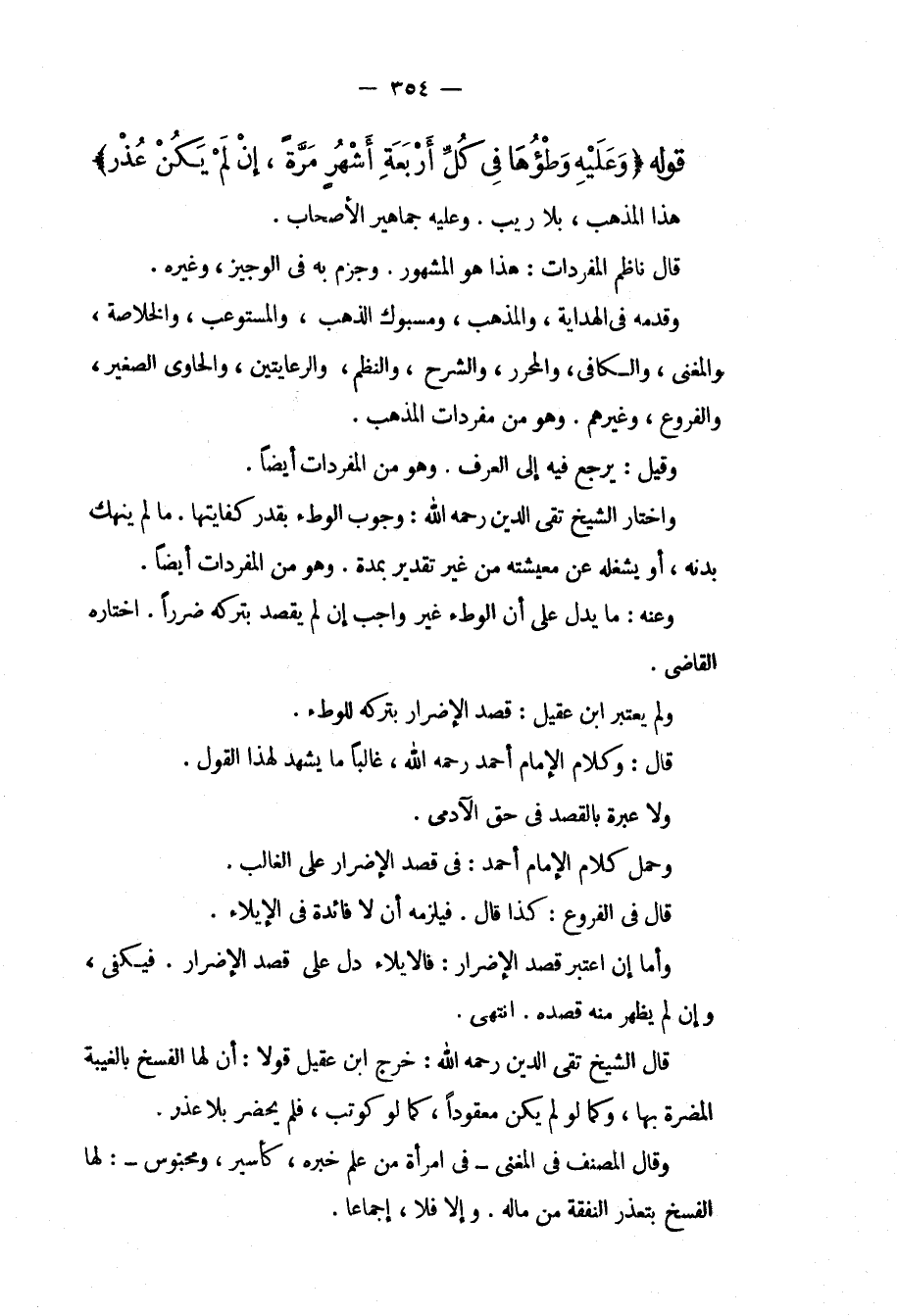 قَوْلُهُ (وَعَلَيْهِ وَطْؤُهَا فِي كُلِّ أَرْبَعَةِ أَشْهُرٍ مَرَّةً، إنْ لَمْ يَكُنْ عُذْرٌ) هَذَا الْمَذْهَبُ، بِلَا رَيْبٍ. وَعَلَيْهِ جَمَاهِيرُ الْأَصْحَابِ. قَالَ نَاظِمُ الْمُفْرَدَاتِ: هَذَا هُوَ الْمَشْهُورُ. وَجَزَمَ بِهِ فِي الْوَجِيزِ، وَغَيْرِهِ. وَقَدَّمَهُ فِي الْهِدَايَةِ، وَالْمُذْهَبِ، وَمَسْبُوكِ الذَّهَبِ، وَالْمُسْتَوْعِبِ، وَالْخُلَاصَةِ، وَالْمُغْنِي، وَالْكَافِي، وَالْمُحَرَّرِ، وَالشَّرْحِ، وَالنَّظْمِ، وَالرِّعَايَتَيْنِ، وَالْحَاوِي الصَّغِيرِ، وَالْفُرُوعِ، وَغَيْرِهِمْ. وَهُوَ مِنْ مُفْرَدَاتِ الْمَذْهَبِ. وَقِيلَ: يَرْجِعُ فِيهِ إلَى الْعُرْفِ. وَهُوَ مِنْ الْمُفْرَدَاتِ أَيْضًا. وَاخْتَارَ الشَّيْخُ تَقِيُّ الدِّينِ - رَحِمَهُ اللَّهُ -: وُجُوبَ الْوَطْءِ بِقَدْرِ كِفَايَتِهَا. مَا لَمْ يُنْهِكْ بَدَنَهُ، أَوْ يَشْغَلْهُ عَنْ مَعِيشَتِهِ مِنْ غَيْرِ تَقْدِيرٍ بِمُدَّةٍ. وَهُوَ مِنْ الْمُفْرَدَاتِ أَيْضًا. وَعَنْهُ: مَا يَدُلُّ عَلَى أَنَّ الْوَطْءَ غَيْرُ وَاجِبٍ إنْ لَمْ يَقْصِدْ بِتَرْكِهِ ضَرَرًا. اخْتَارَهُ الْقَاضِي. وَلَمْ يَعْتَبِرْ ابْنُ عَقِيلٍ: قَصْدَ الْإِضْرَارِ بِتَرْكِهِ لِلْوَطْءِ. قَالَ: وَكَلَامُ الْإِمَامِ أَحْمَدَ - رَحِمَهُ اللَّهُ -، غَالِبًا مَا يَشْهَدُ لِهَذَا الْقَوْلِ. وَلَا عِبْرَةَ بِالْقَصْدِ فِي حَقِّ الْآدَمِيِّ. وَحُمِلَ كَلَامُ الْإِمَامِ أَحْمَدَ: فِي قَصْدِ الْإِضْرَارِ عَلَى الْغَالِبِ. قَالَ فِي الْفُرُوعِ: كَذَا قَالَ. فَيَلْزَمُهُ أَنْ لَا فَائِدَةَ فِي الْإِيلَاءِ. وَأَمَّا إنْ اعْتَبَرَ قَصْدَ الْإِضْرَارِ: فَالْإِيلَاءُ دَلَّ عَلَى قَصْدِ الْإِضْرَارِ. فَيَكْفِي، وَإِنْ لَمْ يَظْهَرْ مِنْهُ قَصْدُهُ. انْتَهَى.
