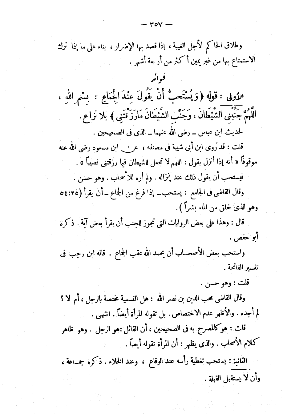 الْأُولَى: قَوْلُهُ (وَيُسْتَحَبُّ أَنْ يَقُولَ عِنْدَ الْجِمَاعِ: بِسْمِ اللَّهِ، اللَّهُمَّ جَنِّبْنِي الشَّيْطَانَ، وَجَنِّبْ الشَّيْطَانَ مَا رَزَقْتنِي) بِلَا نِزَاعٍ. لِحَدِيثِ ابْنِ عَبَّاسٍ - رَضِيَ اللَّهُ عَنْهُمَا - الَّذِي فِي الصَّحِيحَيْنِ. قُلْت: قَدْ رَوَى ابْنُ أَبِي شَيْبَةَ فِي مُصَنَّفِهِ عَنْ ابْنِ مَسْعُودٍ - رَضِيَ اللَّهُ عَنْهُ - مَوْقُوفًا " أَنَّهُ إذَا أَنْزَلَ يَقُولُ: اللَّهُمَّ لَا تَجْعَلْ لِلشَّيْطَانِ فِيمَا رَزَقْتنِي نَصِيبًا ". فَيُسْتَحَبُّ أَنْ يَقُولَ ذَلِكَ عِنْدَ إنْزَالِهِ. وَلَمْ أَرَهُ لِلْأَصْحَابِ. وَهُوَ حَسَنٌ.