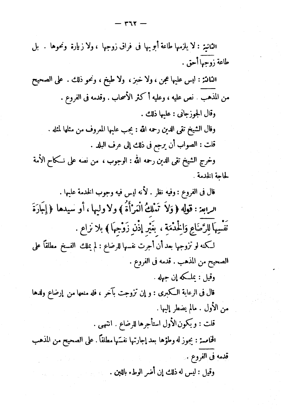 الرَّابِعَةُ: قَوْلُهُ (وَلَا تَمْلِكُ الْمَرْأَةُ) وَلَا وَلِيُّهَا، أَوْ سَيِّدُهَا (إجَارَةَ نَفْسِهَا لِلرَّضَاعِ وَالْخِدْمَةِ، بِغَيْرِ إذْنِ زَوْجِهَا) بِلَا نِزَاعٍ.