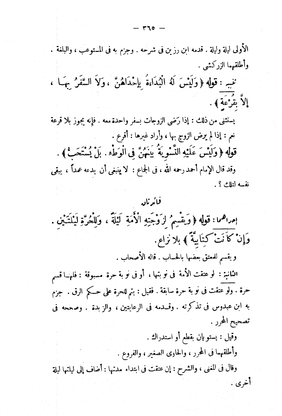 إحْدَاهُمَا: قَوْلُهُ (وَيُقْسِمُ لِزَوْجَتِهِ الْأَمَةِ لَيْلَةً، وَلِلْحُرَّةِ لَيْلَتَيْنِ. وَإِنْ كَانَتْ كِتَابِيَّةً) بِلَا نِزَاعٍ. وَيُقْسِمُ لِلْمُعْتَقِ بَعْضُهَا بِالْحِسَابِ. قَالَهُ الْأَصْحَابُ. الثَّانِيَةُ: لَوْ عَتَقَتْ الْأَمَةُ فِي نَوْبَتِهَا، أَوْ فِي نَوْبَةِ حُرَّةٍ مَسْبُوقَةٍ: فَلَهَا قَسْمُ حُرَّةٍ. وَلَوْ عَتَقَتْ فِي نَوْبَةِ حُرَّةٍ سَابِقَةٍ. فَقِيلَ: يُتِمُّ لِلْحُرَّةِ عَلَى حُكْمِ الرِّقِّ. جَزَمَ بِهِ ابْنُ عَبْدُوسٍ فِي تَذْكِرَتِهِ. وَقَدَّمَهُ فِي الرِّعَايَتَيْنِ، وَالزُّبْدَةِ. وَصَحَّحَهُ فِي تَصْحِيحِ الْمُحَرَّرِ. وَقِيلَ: يَسْتَوِيَانِ بِقَطْعٍ أَوْ اسْتِدْرَاكٍ. وَأَطْلَقَهُمَا فِي الْمُحَرَّرِ، وَالْحَاوِي الصَّغِيرِ، وَالْفُرُوعِ. وَقَالَ فِي الْمُغْنِي، وَالشَّرْحِ: إنْ عَتَقَتْ فِي ابْتِدَاءِ مُدَّتِهَا: أَضَافَ إلَى لَيْلَتِهَا لَيْلَةً أُخْرَى.