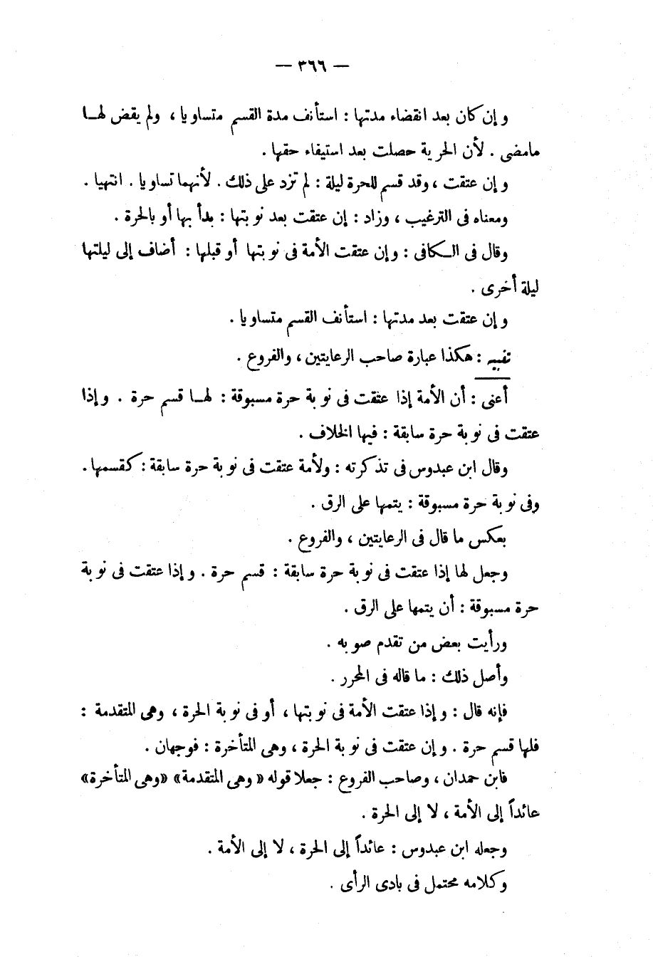 وَإِنْ كَانَ بَعْدَ انْقِضَاءِ مُدَّتِهَا: اسْتَأْنَفَ مُدَّةَ الْقَسْمِ مُتَسَاوِيًا، وَلَمْ يَقْضِ لَهَا مَا مَضَى؛ لِأَنَّ الْحُرَّةَ حَصَلَتْ بَعْدَ اسْتِيفَاءِ حَقِّهَا. وَإِنْ عَتَقَتْ، وَقَدْ قَسَمَ لِلْحُرَّةِ لَيْلَةً: لَمْ تَزِدْ عَلَى ذَلِكَ؛ لِأَنَّهُمَا تَسَاوَيَا. انْتَهَى. وَمَعْنَاهُ فِي التَّرْغِيبِ، وَزَادَ: إنْ عَتَقَتْ بَعْدَ نَوْبَتِهَا: بَدَأَ بِهَا أَوْ بِالْحُرَّةِ. وَقَالَ فِي الْكَافِي: وَإِنْ عَتَقَتْ الْأَمَةُ فِي نَوْبَتِهَا أَوْ قَبْلَهَا: أَضَافَ إلَى لَيْلَتِهَا لَيْلَةً أُخْرَى. وَإِنْ عَتَقَتْ بَعْدَ مُدَّتِهَا: اسْتَأْنَفَ الْقَسْمَ مُتَسَاوِيًا.