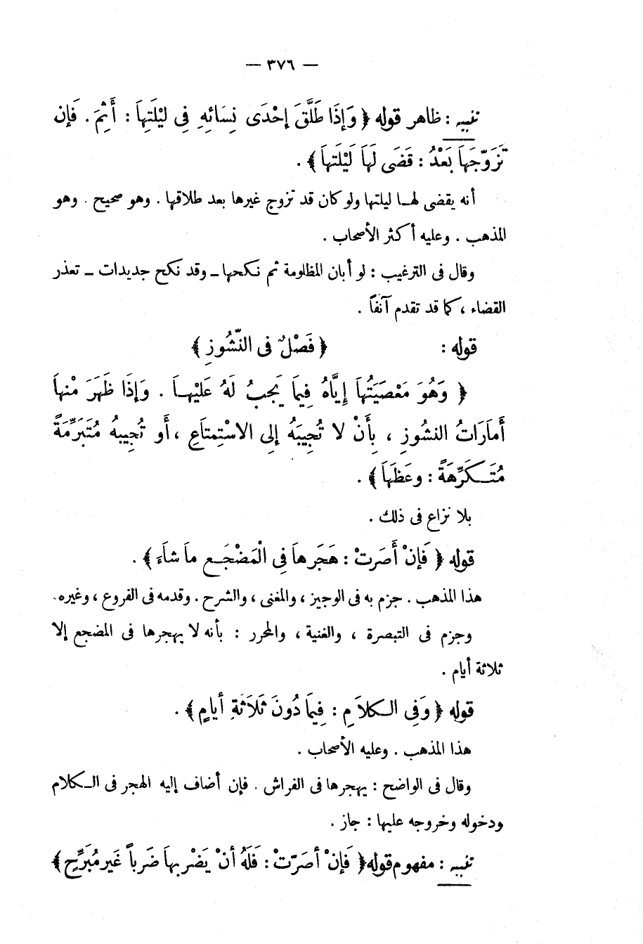 (فَصْلٌ فِي النُّشُوزِ) (وَهُوَ مَعْصِيَتُهَا إيَّاهُ فِيمَا يَجِبُ لَهُ وَعَلَيْهَا. وَإِذَا ظَهَرَ مِنْهَا أَمَارَاتُ النُّشُوزِ، بِأَنْ لَا تُجِيبَهُ إلَى الِاسْتِمْتَاعِ، أَوْ تُجِيبَهُ مُتَبَرِّمَةً مُتَكَرِّهَةً: وَعَظَهَا) . بِلَا نِزَاعٍ فِي ذَلِكَ. قَوْلُهُ (فَإِنْ أَصَرَّتْ: هَجَرَهَا فِي الْمَضْجَعِ مَا شَاءَ) . هَذَا الْمَذْهَبُ. جَزَمَ بِهِ فِي الْوَجِيزِ، وَالْمُغْنِي، وَالشَّرْحِ. وَقَدَّمَهُ فِي الْفُرُوعِ، وَغَيْرِهِ وَجَزَمَ فِي التَّبْصِرَةِ، وَالْغُنْيَةِ، وَالْمُحَرَّرِ: بِأَنَّهُ لَا يَهْجُرُهَا فِي الْمَضْجَعِ إلَّا ثَلَاثَةَ أَيَّامٍ. قَوْلُهُ (وَفِي الْكَلَامِ: فِيمَا دُونَ ثَلَاثَةِ أَيَّامٍ) . هَذَا الْمَذْهَبُ. وَعَلَيْهِ الْأَصْحَابُ. وَقَالَ فِي الْوَاضِحِ: يَهْجُرُهَا فِي الْفِرَاشِ فَإِنْ أَضَافَ إلَيْهِ الْهَجْرَ فِي الْكَلَامِ وَدُخُولَهُ وَخُرُوجَهُ عَلَيْهَا: جَازَ.