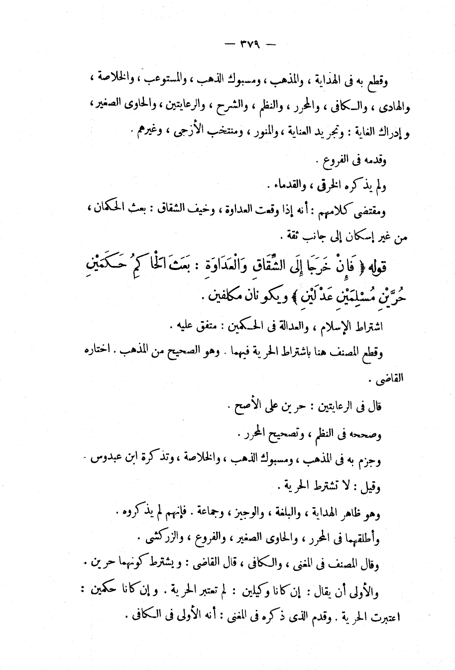 قَوْلُهُ (فَإِنْ خَرَجَا إلَى الشِّقَاقِ وَالْعَدَاوَةِ: بَعَثَ الْحَاكِمُ حَكَمَيْنِ حُرَّيْنِ مُسْلِمَيْنِ عَدْلَيْنِ) وَيَكُونَانِ مُكَلَّفَيْنِ. اشْتِرَاطُ الْإِسْلَامِ، وَالْعَدَالَةِ فِي الْحَكَمَيْنِ: مُتَّفَقٌ عَلَيْهِ. وَقَطَعَ الْمُصَنِّفُ هُنَا بِاشْتِرَاطِ الْحُرِّيَّةِ فِيهِمَا. وَهُوَ الصَّحِيحُ مِنْ الْمَذْهَبِ اخْتَارَهُ الْقَاضِي. قَالَ فِي الرِّعَايَتَيْنِ: حُرَّيْنِ عَلَى الْأَصَحِّ. وَصَحَّحَهُ فِي النَّظْمِ، وَتَصْحِيحِ الْمُحَرَّرِ وَجَزَمَ بِهِ فِي الْمُذْهَبِ، وَمَسْبُوكِ الذَّهَبِ، وَالْخُلَاصَةِ، وَتَذْكِرَةِ ابْنِ عَبْدُوسٍ وَقِيلَ: لَا تُشْتَرَطُ الْحُرِّيَّةُ. وَهُوَ ظَاهِرُ الْهِدَايَةِ، وَالْبُلْغَةِ، وَالْوَجِيزِ، وَجَمَاعَةٍ. فَإِنَّهُمْ لَمْ يَذْكُرُوهُ. وَأَطْلَقَهُمَا فِي الْمُحَرَّرِ، وَالْحَاوِي الصَّغِيرِ، وَالْفُرُوعِ، وَالزَّرْكَشِيُّ. وَقَالَ الْمُصَنِّفُ فِي الْمُغْنِي، وَالْكَافِي، قَالَ الْقَاضِي: وَيُشْتَرَطُ كَوْنُهُمَا حُرَّيْنِ. وَالْأَوْلَى أَنْ يُقَالَ: إنْ كَانَا وَكِيلَيْنِ: لَمْ تُعْتَبَرْ الْحُرِّيَّةُ. وَإِنْ كَانَا حَكَمَيْنِ: اُعْتُبِرَتْ الْحُرِّيَّةُ. وَقُدِّمَ الَّذِي ذَكَرَهُ فِي الْمُغْنِي: أَنَّهُ الْأَوْلَى فِي الْكَافِي.