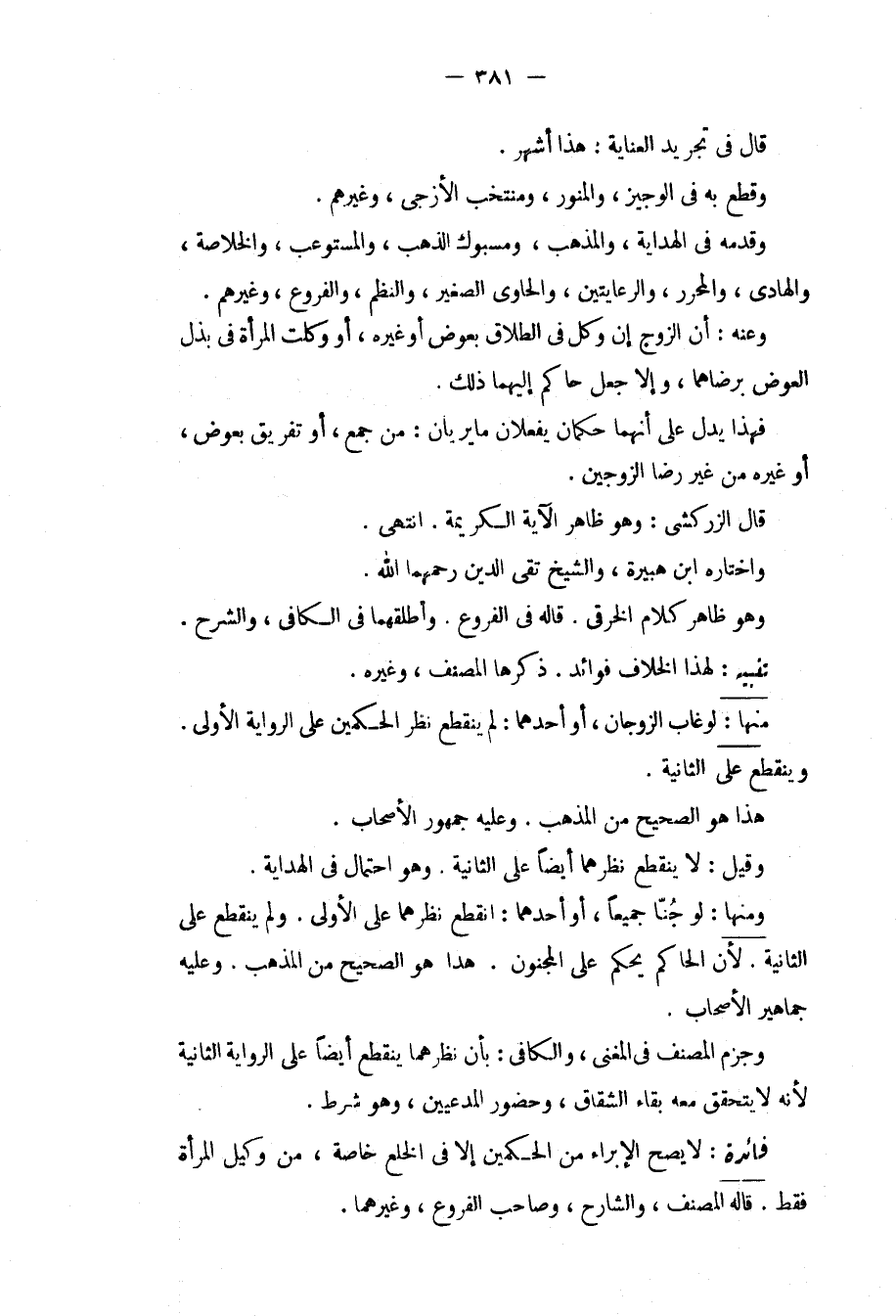 قَالَ فِي تَجْرِيدِ الْعِنَايَةِ: هَذَا أَشْهَرُ. وَقَطَعَ بِهِ فِي الْوَجِيزِ، وَالْمُنَوِّرِ، وَمُنْتَخَبِ الْأَزَجِيِّ، وَغَيْرِهِمْ. وَقَدَّمَهُ فِي الْهِدَايَةِ، وَالْمُذْهَبِ، وَمَسْبُوكِ الذَّهَبِ، وَالْمُسْتَوْعِبِ، وَالْخُلَاصَةِ، وَالْهَادِي، وَالْمُحَرَّرِ، وَالرِّعَايَتَيْنِ، وَالْحَاوِي الصَّغِيرِ، وَالنَّظْمِ، وَالْفُرُوعِ، وَغَيْرِهِمْ. وَعَنْهُ: أَنَّ الزَّوْجَ إنْ وَكَّلَ فِي الطَّلَاقِ بِعِوَضٍ أَوْ غَيْرِهِ، أَوْ وَكَّلَتْ الْمَرْأَةُ فِي بَذْلِ الْعِوَضِ بِرِضَاهُمَا، وَإِلَّا جَعَلَ حَاكِمٌ إلَيْهِمَا ذَلِكَ. فَهَذَا يَدُلُّ عَلَى أَنَّهُمَا حَكَمَانِ يَفْعَلَانِ مَا يَرَيَانِ: مِنْ جَمْعٍ، أَوْ تَفْرِيقٍ بِعِوَضٍ، أَوْ غَيْرِهِ مِنْ غَيْرِ رِضَا الزَّوْجَيْنِ. قَالَ الزَّرْكَشِيُّ: وَهُوَ ظَاهِرُ الْآيَةِ الْكَرِيمَةِ. انْتَهَى.