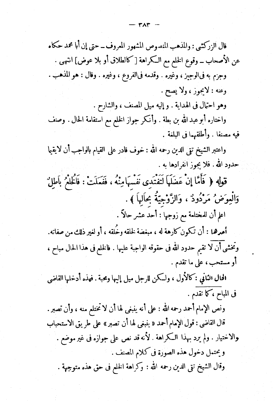 وَجَزَمَ بِهِ فِي الْوَجِيزِ، وَغَيْرِهِ. وَقَدَّمَهُ فِي الْفُرُوعِ، وَغَيْرِهِ. وَقَالَ: هُوَ الْمَذْهَبُ. وَعَنْهُ: لَا يَجُوزُ، وَلَا يَصِحُّ. وَهُوَ احْتِمَالٌ فِي الْهِدَايَةِ. وَإِلَيْهِ مَيْلُ الْمُصَنِّفِ، وَالشَّارِحِ. وَاخْتَارَهُ أَبُو عَبْدِ اللَّهِ بْنُ بَطَّةَ. وَأَنْكَرَ جَوَازَ الْخُلْعِ مَعَ اسْتِقَامَةِ الْحَالِ. وَصَنَّفَ فِيهِ مُصَنَّفًا. وَأَطْلَقَهُمَا فِي الْبُلْغَةِ. وَاعْتَبَرَ الشَّيْخُ تَقِيُّ الدِّينِ - رَحِمَهُ اللَّهُ -: خَوْفَ قَادِرٍ عَلَى الْقِيَامِ بِالْوَاجِبِ أَنْ لَا يُقِيمَا حُدُودَ اللَّهِ. فَلَا يَجُوزُ انْفِرَادُهَا بِهِ.