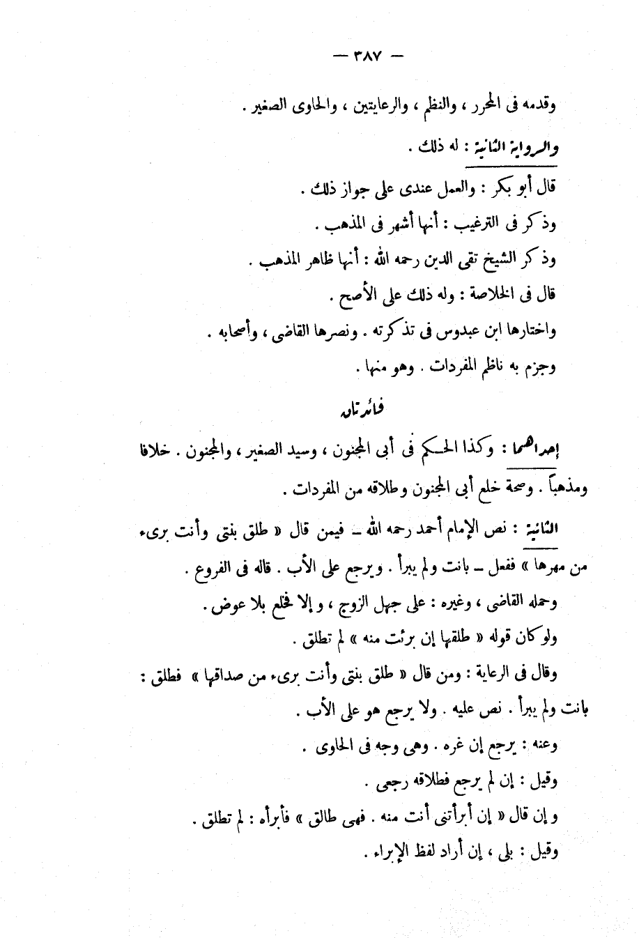 إحْدَاهُمَا: وَكَذَا الْحُكْمُ فِي أَبِي الْمَجْنُونِ، وَسَيِّدِ الصَّغِيرِ، وَالْمَجْنُونِ خِلَافًا وَمَذْهَبًا. وَصِحَّةُ خُلْعِ أَبِي الْمَجْنُونِ وَطَلَاقِهِ مِنْ الْمُفْرَدَاتِ. الثَّانِيَةُ: نَصَّ الْإِمَامُ أَحْمَدُ - رَحِمَهُ اللَّهُ - فِيمَنْ قَالَ " طَلِّقْ بِنْتِي وَأَنْتَ بَرِيءٌ مِنْ مَهْرِهَا " فَفَعَلَ بَانَتْ وَلَمْ يَبْرَأْ. وَيَرْجِعُ عَلَى الْأَبِ. قَالَهُ فِي الْفُرُوعِ. وَحَمَلَهُ الْقَاضِي، وَغَيْرُهُ: عَلَى جَهْلِ الزَّوْجِ، وَإِلَّا فَخُلْعٌ بِلَا عِوَضٍ. وَلَوْ كَانَ قَوْلُهُ " طَلِّقْهَا إنْ بَرِئَتْ مِنْهُ " لَمْ تَطْلُقْ. وَقَالَ فِي الرِّعَايَةِ: وَمَنْ قَالَ " طَلِّقْ بِنْتِي وَأَنْتَ بَرِيءٌ مِنْ صَدَاقِهَا " فَطَلَّقَ: بَانَتْ وَلَمْ يَبْرَأْ. نَصَّ عَلَيْهِ. وَلَا يَرْجِعُ هُوَ عَلَى الْأَبِ. وَعَنْهُ: يَرْجِعُ إنْ غَرَّهُ. وَهِيَ وَجْهٌ فِي الْحَاوِي. وَقِيلَ: إنْ لَمْ يَرْجِعْ فَطَلَاقُهُ رَجْعِيٌّ. وَإِنْ قَالَ " إنْ أَبْرَأْتَنِي أَنْتَ مِنْهُ فَهِيَ طَالِقٌ " فَأَبْرَأَهُ: لَمْ تَطْلُقْ. وَقِيلَ: بَلَى، إنْ أَرَادَ لَفْظَ الْإِبْرَاءِ.