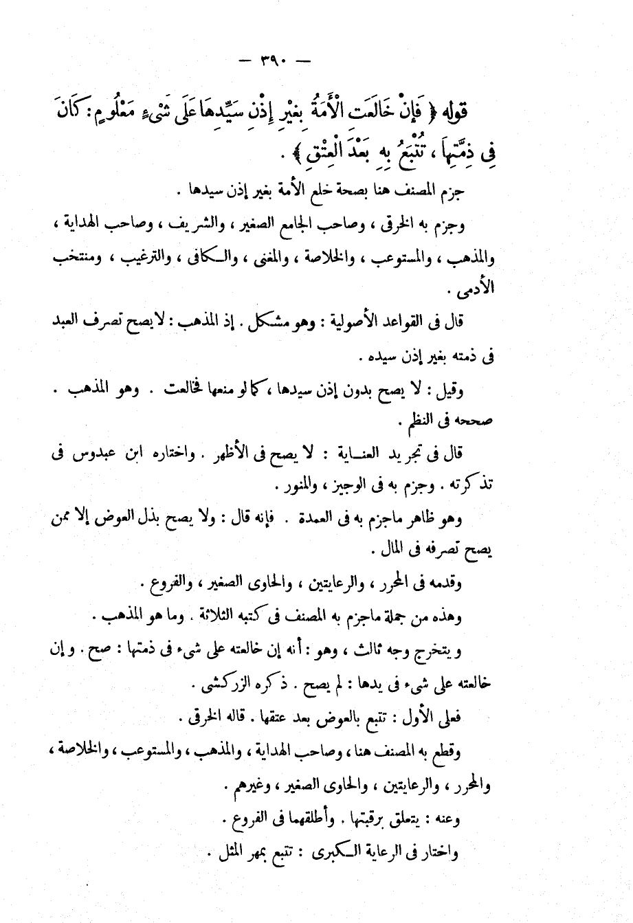 قَوْلُهُ (فَإِنْ خَالَعَتْ الْأَمَةُ بِغَيْرِ إذْنِ سَيِّدِهَا عَلَى شَيْءٍ مَعْلُومٍ: كَانَ فِي ذِمَّتِهَا، تُتْبَعُ بِهِ بَعْدَ الْعِتْقِ) . جَزَمَ الْمُصَنِّفُ هُنَا بِصِحَّةِ خُلْعِ الْأَمَةِ بِغَيْرِ إذْنِ سَيِّدِهَا. وَجَزَمَ بِهِ الْخِرَقِيُّ، وَصَاحِبُ الْجَامِعِ الصَّغِيرِ، وَالشَّرِيفُ، وَصَاحِبُ الْهِدَايَةِ، وَالْمُذْهَبِ، وَالْمُسْتَوْعِبِ، وَالْخُلَاصَةِ، وَالْمُغْنِي، وَالْكَافِي، وَالتَّرْغِيبِ، وَمُنْتَخَبِ الْأَدَمِيِّ. قَالَ فِي الْقَوَاعِدِ الْأُصُولِيَّةِ: وَهُوَ مُشْكِلٌ. إذْ الْمَذْهَبُ: لَا يَصِحُّ تَصَرُّفُ الْعَبْدِ فِي ذِمَّتِهِ بِغَيْرِ إذْنِ سَيِّدِهِ. وَقِيلَ: لَا يَصِحُّ بِدُونِ إذْنِ سَيِّدِهَا كَمَا لَوْ مَنَعَهَا فَخَالَعَتْ. وَهُوَ الْمَذْهَبُ. صَحَّحَهُ فِي النَّظْمِ. قَالَ فِي تَجْرِيدِ الْعِنَايَةِ: لَا يَصِحُّ فِي الْأَظْهَرِ. وَاخْتَارَهُ ابْنُ عَبْدُوسٍ فِي تَذْكِرَتِهِ. وَجَزَمَ بِهِ فِي الْوَجِيزِ، وَالْمُنَوِّرِ. وَهُوَ ظَاهِرُ مَا جَزَمَ بِهِ فِي الْعُمْدَةِ. فَإِنَّهُ قَالَ: وَلَا يَصِحُّ بَذْلُ الْعِوَضِ إلَّا مِمَّنْ يَصِحُّ تَصَرُّفُهُ فِي الْمَالِ. وَقَدَّمَهُ فِي الْمُحَرَّرِ، وَالرِّعَايَتَيْنِ، وَالْحَاوِي الصَّغِيرِ، وَالْفُرُوعِ. وَهَذِهِ مِنْ جُمْلَةِ مَا جَزَمَ بِهِ الْمُصَنِّفُ فِي كُتُبِهِ الثَّلَاثَةِ وَمَا هُوَ الْمَذْهَبُ. وَيَتَخَرَّجُ وَجْهٌ ثَالِثٌ، وَهُوَ: أَنَّهُ إنْ خَالَعَتْهُ عَلَى شَيْءٍ فِي ذِمَّتِهَا: صَحَّ. وَإِنْ خَالَعَتْهُ عَلَى شَيْءٍ فِي يَدِهَا: لَمْ يَصِحَّ. ذَكَرَهُ الزَّرْكَشِيُّ.