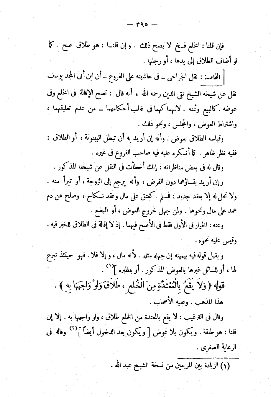 وَقِيَاسُهُ الطَّلَاقُ بِعِوَضٍ. وَأَنَّهُ إنْ أُرِيدَ بِهِ أَنْ تَبْطُلَ الْبَيْنُونَةُ، أَوَالطَّلَاقُ: فَفِيهِ نَظَرٌ ظَاهِرٌ. كَمَا أَنْكَرَهُ عَلَيْهِ فِيهِ صَاحِبُ الْفُرُوعِ فِي غَيْرِهِ. وَقَالَ لَهُ فِي بَعْضِ مُنَاظَرَاتِهِ: إنَّك أَخْطَأْت فِي النَّقْلِ عَنْ شَيْخِنَا الْمَذْكُورِ. وَإِنْ أُرِيدَ بَقَاؤُهُمَا دُونَ الْفَرْضِ، وَأَنَّهُ يَرْجِعُ إلَى الزَّوْجَةِ، أَوْ تَبْرَأُ مِنْهُ. وَلَا تَحِلُّ لَهُ إلَّا بِعَقْدٍ جَدِيدٍ: فَمُسَلَّمٌ، كَعِتْقٍ عَلَى مَالٍ وَعَقْدِ نِكَاحٍ، وَصُلْحٍ عَنْ دَمِ عَمْدٍ عَلَى مَالٍ وَنَحْوِهَا. وَلِمَنْ جَهِلَ خُرُوجَ الْعِوَضِ، أَوْ الْبُضْعِ. وَعَنْهُ: الْخِيَارُ فِي الْأَوَّلِ فَقَطْ فِي الْأَصَحِّ فِيهِمَا. إذْ لَا إقَالَةَ فِي الطَّلَاقِ لِلْخَبَرِ فِيهِ. وَقِيسَ عَلَيْهِ نَحْوُهُ. وَيُقْبَلُ قَوْلُهُ فِيهِ بِيَمِينِهِ إنْ جَهِلَهُ مِثْلُهُ؛ لِأَنَّهُ مَالٌ، وَإِلَّا فَلَا. فَهُوَ حِينَئِذٍ تَبَرُّعٌ لَهَا، أَوْ لِلسَّائِلِ غَيْرِهَا بِالْعِوَضِ الْمَذْكُورِ. أَوْ [بِنَظِيرِهِ] .