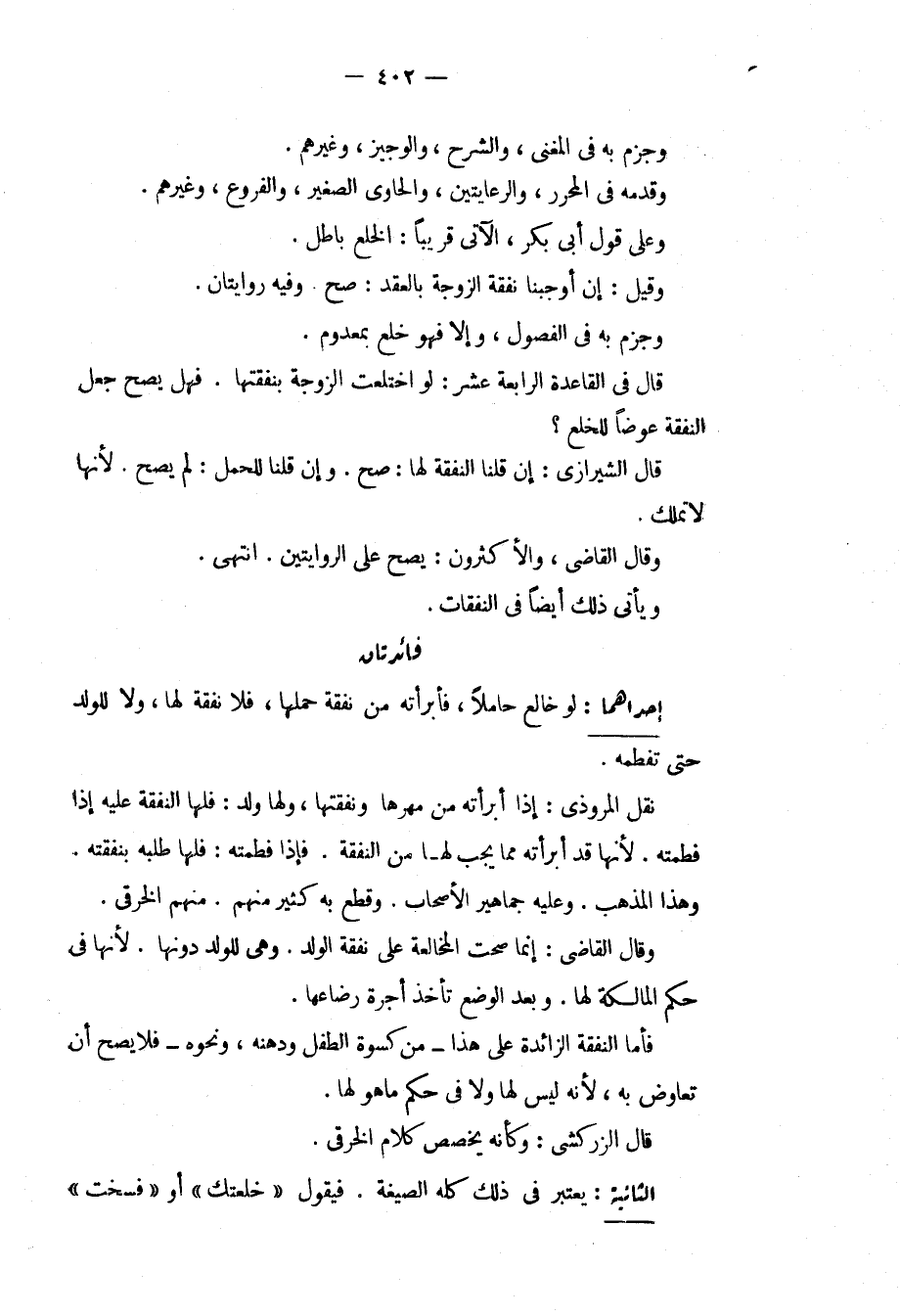 وَعَلَى قَوْلِ أَبِي بَكْرٍ، الْآتِي قَرِيبًا: الْخُلْعُ بَاطِلٌ. وَقِيلَ: إنْ أَوْجَبْنَا نَفَقَةَ الزَّوْجَةِ بِالْعَقْدِ: صَحَّ. وَفِيهِ رِوَايَتَانِ. وَجَزَمَ بِهِ فِي الْفُصُولِ، وَإِلَّا فَهُوَ خُلْعٌ مَعْدُومٌ قَالَ فِي الْقَاعِدَةِ الرَّابِعَةَ عَشَرَ: لَوْ اخْتَلَعَتْ الزَّوْجَةُ بِنَفَقَتِهَا. فَهَلْ يَصِحُّ جَعْلُ النَّفَقَةِ عِوَضًا لِلْخُلْعِ؟