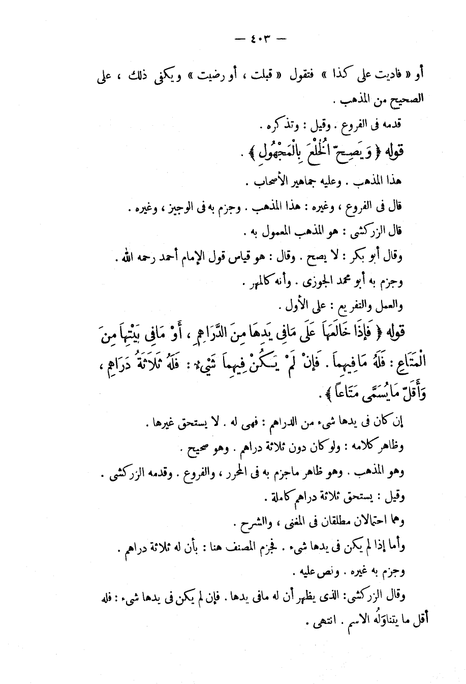 قَالَ الزَّرْكَشِيُّ: هُوَ الْمَذْهَبُ الْمَعْمُولُ بِهِ. وَقَالَ أَبُو بَكْرٍ: لَا يَصِحُّ. وَقَالَ: هُوَ قِيَاسُ قَوْلِ الْإِمَامِ أَحْمَدَ - رَحِمَهُ اللَّهُ -. وَجَزَمَ بِهِ أَبُو مُحَمَّدٍ الْجَوْزِيُّ. وَأَنَّهُ كَالْمَهْرِ. وَالْعَمَلُ وَالتَّفْرِيعُ: عَلَى الْأَوَّلِ.