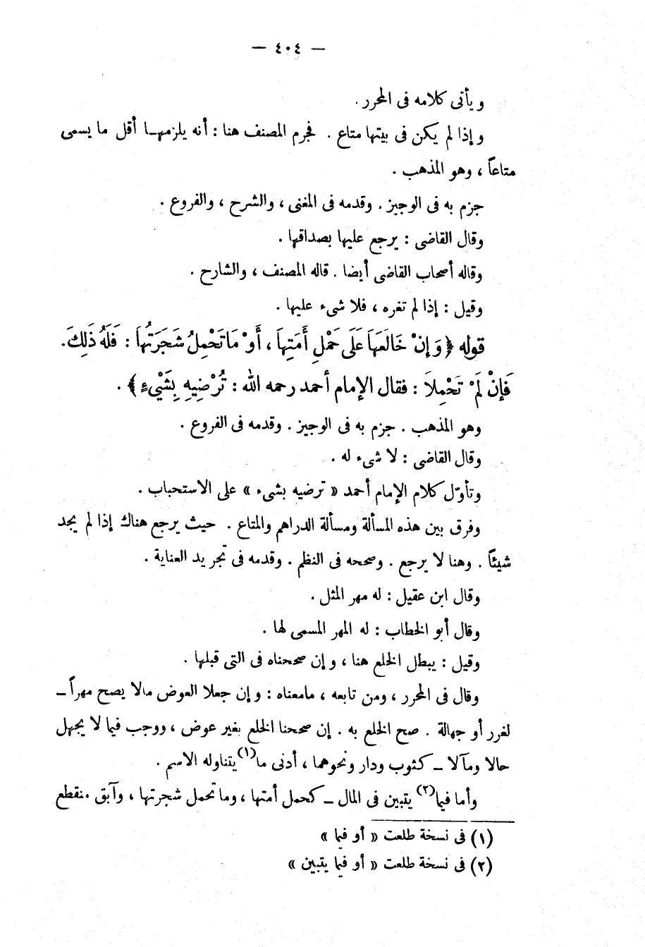 قَوْلُهُ (وَإِنْ خَالَعَهَا عَلَى حَمْلِ أَمَتِهَا، أَوْ مَا تَحْمِلُ شَجَرَتُهَا: فَلَهُ ذَلِكَ. فَإِنْ لَمْ تَحْمِلَا: فَقَالَ الْإِمَامُ أَحْمَدُ - رَحِمَهُ اللَّهُ -: تُرْضِيهِ بِشَيْءٍ) . وَهُوَ الْمَذْهَبُ. جَزَمَ بِهِ فِي الْوَجِيزِ. وَقَدَّمَهُ فِي الْفُرُوعِ. وَقَالَ الْقَاضِي: لَا شَيْءَ لَهُ. وَتَأَوَّلَ كَلَامَ الْإِمَامِ أَحْمَدَ " تُرْضِيهِ بِشَيْءٍ " عَلَى الِاسْتِحْبَابِ. وَفَرَّقَ بَيْنَ هَذِهِ الْمَسْأَلَةِ وَمَسْأَلَةِ الدَّرَاهِمِ وَالْمَتَاعِ. حَيْثُ يَرْجِعُ هُنَاكَ إذَا لَمْ يَجِدْ شَيْئًا. وَهُنَا لَا يَرْجِعُ. وَصَحَّحَهُ فِي النَّظْمِ. وَقَدَّمَهُ فِي تَجْرِيدِ الْعِنَايَةِ. وَقَالَ ابْنُ عَقِيلٍ: لَهُ مَهْرُ الْمِثْلِ. وَقَالَ أَبُو الْخَطَّابِ: لَهُ الْمَهْرُ الْمُسَمَّى لَهَا. وَقِيلَ: يَبْطُلُ الْخُلْعُ هُنَا، وَإِنْ صَحَّحْنَاهُ فِي الَّتِي قَبْلَهَا. وَقَالَ فِي الْمُحَرَّرِ، وَمَنْ تَابَعَهُ، مَا مَعْنَاهُ: وَإِنْ جَعَلَا الْعِوَضَ مَالًا يَصِحُّ مَهْرًا لِغَرَرٍ أَوْ جَهَالَةٍ. صَحَّ الْخُلْعُ بِهِ. إنْ صَحَحْنَا الْخُلْعَ بِغَيْرِ عِوَضٍ، وَوَجَبَ فِيمَا لَا يُجْهَلُ حَالًا وَمَآلًا كَثَوْبٍ وَدَارٍ وَنَحْوِهِمَا، أَدْنَى مَا يَتَنَاوَلُهُ الِاسْمُ. وَأَمَّا فِيمَا يَتَبَيَّنُ فِي الْمَالِ كَحَمْلِ أَمَتِهَا، وَمَا تَحْمِلُ شَجَرَتُهَا، وَآبِقٍ مُنْقَطِعٍ