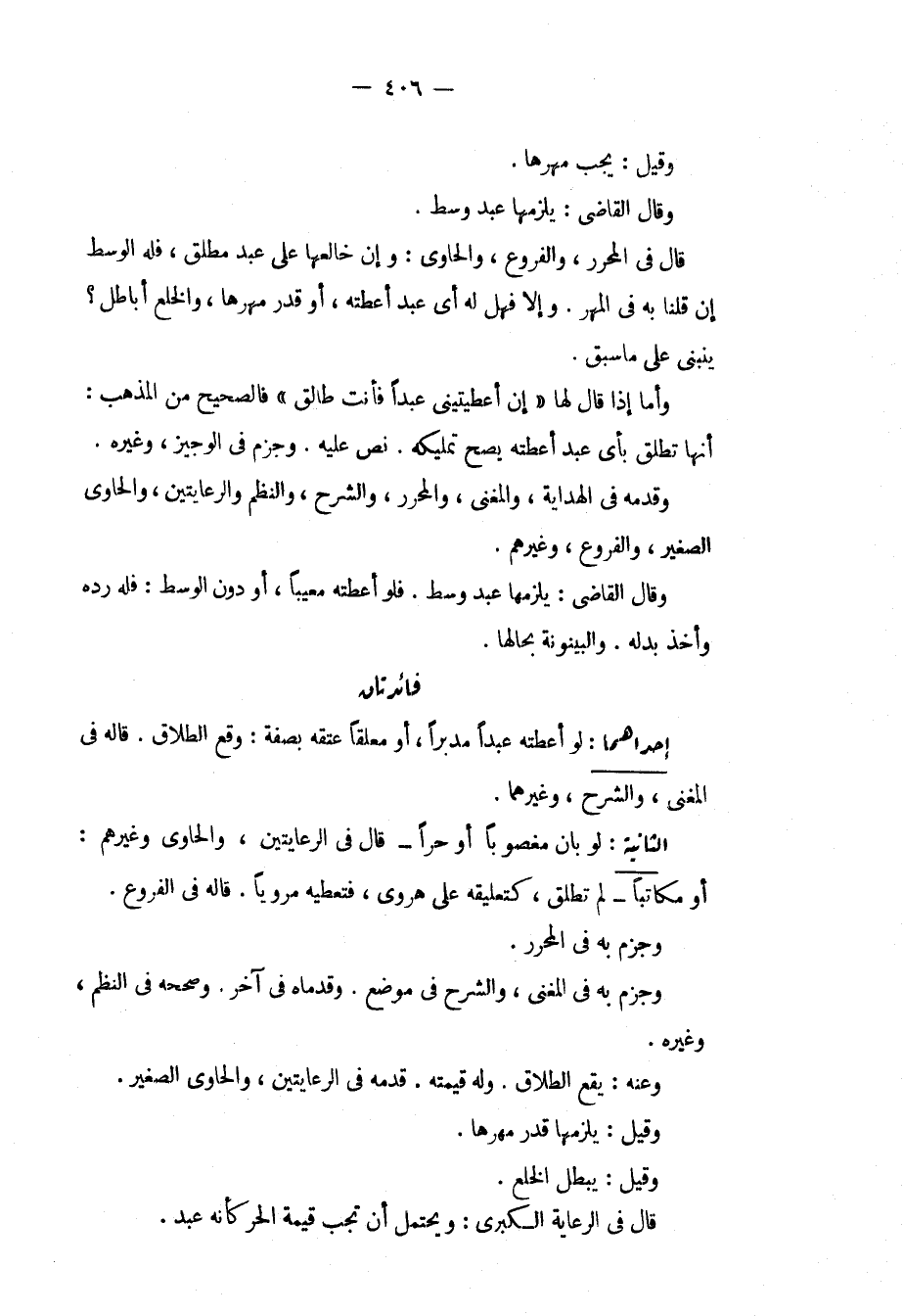 وَقِيلَ: يَجِبُ مَهْرُهَا. وَقَالَ الْقَاضِي: يَلْزَمُهَا عَبْدٌ وَسَطٌ. قَالَ فِي الْمُحَرَّرِ، وَالْفُرُوعِ، وَالْحَاوِي: وَإِنْ خَالَعَهَا عَلَى عَبْدٍ مُطْلَقٍ، فَلَهُ الْوَسَطُ إنْ قُلْنَا بِهِ فِي الْمَهْرِ. وَإِلَّا فَهَلْ لَهُ أَيُّ عَبْدٍ أَعْطَتْهُ، أَوْ قَدْرُ مَهْرِهَا، وَالْخُلْعُ أَبَاطِلٌ؟ يَنْبَنِي عَلَى مَا سَبَقَ. وَأَمَّا إذَا قَالَ لَهَا " إنْ أَعْطَيْتِينِي عَبْدًا فَأَنْتِ طَالِقٌ " فَالصَّحِيحُ مِنْ الْمَذْهَبِ: أَنَّهَا تَطْلُقُ بِأَيِّ عَبْدٍ أَعْطَتْهُ يَصِحُّ تَمْلِيكُهُ. نَصَّ عَلَيْهِ. وَجَزَمَ فِي الْوَجِيزِ، وَغَيْرِهِ. وَقَدَّمَهُ فِي الْهِدَايَةِ، وَالْمُغْنِي، وَالْمُحَرَّرِ، وَالشَّرْحِ، وَالنَّظْمِ وَالرِّعَايَتَيْنِ، وَالْحَاوِي الصَّغِيرِ، وَالْفُرُوعِ، وَغَيْرِهِمْ. وَقَالَ الْقَاضِي: يَلْزَمُهَا عَبْدٌ وَسَطٌ. فَلَوْ أَعْطَتْهُ مَعِيبًا، أَوْ دُونَ الْوَسَطِ: فَلَهُ رَدُّهُ وَأَخْذُ بَدَلِهِ. وَالْبَيْنُونَةُ بِحَالِهِمَا.