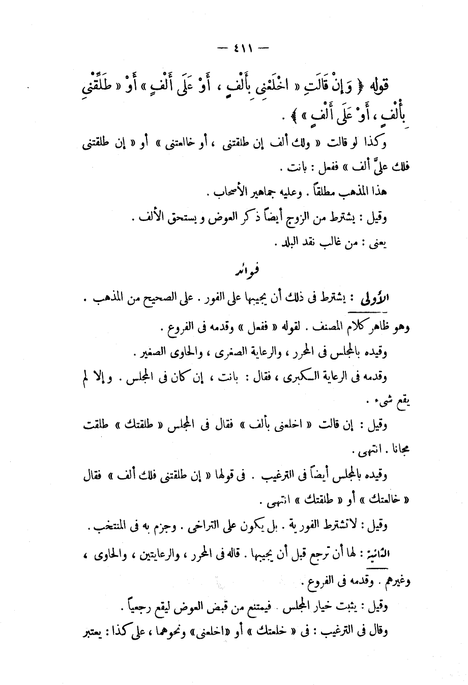 وَقِيلَ: لَا تُشْتَرَطُ الْفَوْرِيَّةُ. بَلْ يَكُونُ عَلَى التَّرَاخِي. وَجَزَمَ بِهِ فِي الْمُنْتَخَبِ. الثَّانِيَةُ: لَهَا أَنْ تَرْجِعَ قَبْلَ أَنْ يُجِيبَهَا. قَالَهُ فِي الْمُحَرَّرِ، وَالرِّعَايَتَيْنِ، وَالْحَاوِي، وَغَيْرِهِمْ. وَقَدَّمَهُ فِي الْفُرُوعِ. وَقِيلَ: يَثْبُتُ خِيَارُ الْمَجْلِسِ. فَيَمْتَنِعُ مِنْ قَبْضِ الْعِوَضِ لِيَقَعَ رَجْعِيًّا. وَقَالَ فِي التَّرْغِيبِ: فِي " خَلَعْتُك " أَوْ " اخْلَعْنِي " وَنَحْوِهِمَا، عَلَى كَذَا: يُعْتَبَرُ