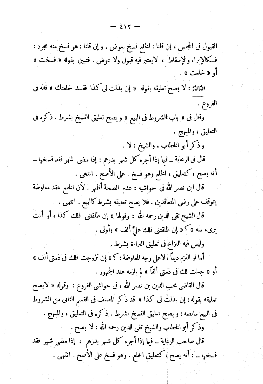 قَالَ الْقَاضِي مُحِبُّ الدِّينِ بْنُ نَصْرِ اللَّهِ، فِي حَوَاشِي الْفُرُوعِ: وَقَوْلُهُ " لَا يَصِحُّ تَعْلِيقُهُ بِقَوْلِهِ: إنْ بَذَلْت لِي كَذَا " قَدْ ذَكَرَ الْمُصَنِّفُ فِي الْقِسْمِ الثَّانِي مِنْ الشُّرُوطِ فِي الْبَيْعِ مَا نَصُّهُ: وَيَصِحُّ تَعْلِيقُ الْفَسْخِ بِشَرْطٍ. ذَكَرَهُ فِي التَّعْلِيقِ، وَالْمُبْهِجِ. وَذَكَرَ أَبُو الْخَطَّابِ وَالشَّيْخُ تَقِيُّ الدِّينِ - رَحِمَهُ اللَّهُ -: لَا يَصِحُّ. قَالَ صَاحِبُ الرِّعَايَةِ فِيمَا إذَا أَجَّرَهُ كُلَّ شَهْرٍ بِدِرْهَمٍ، إذَا مَضَى شَهْرٌ فَقَدْ فَسَخَهَا: أَنَّهُ يَصِحُّ، كَتَعْلِيقِ الْخُلْعِ. وَهُوَ فَسْخٌ عَلَى الْأَصَحِّ. انْتَهَى.