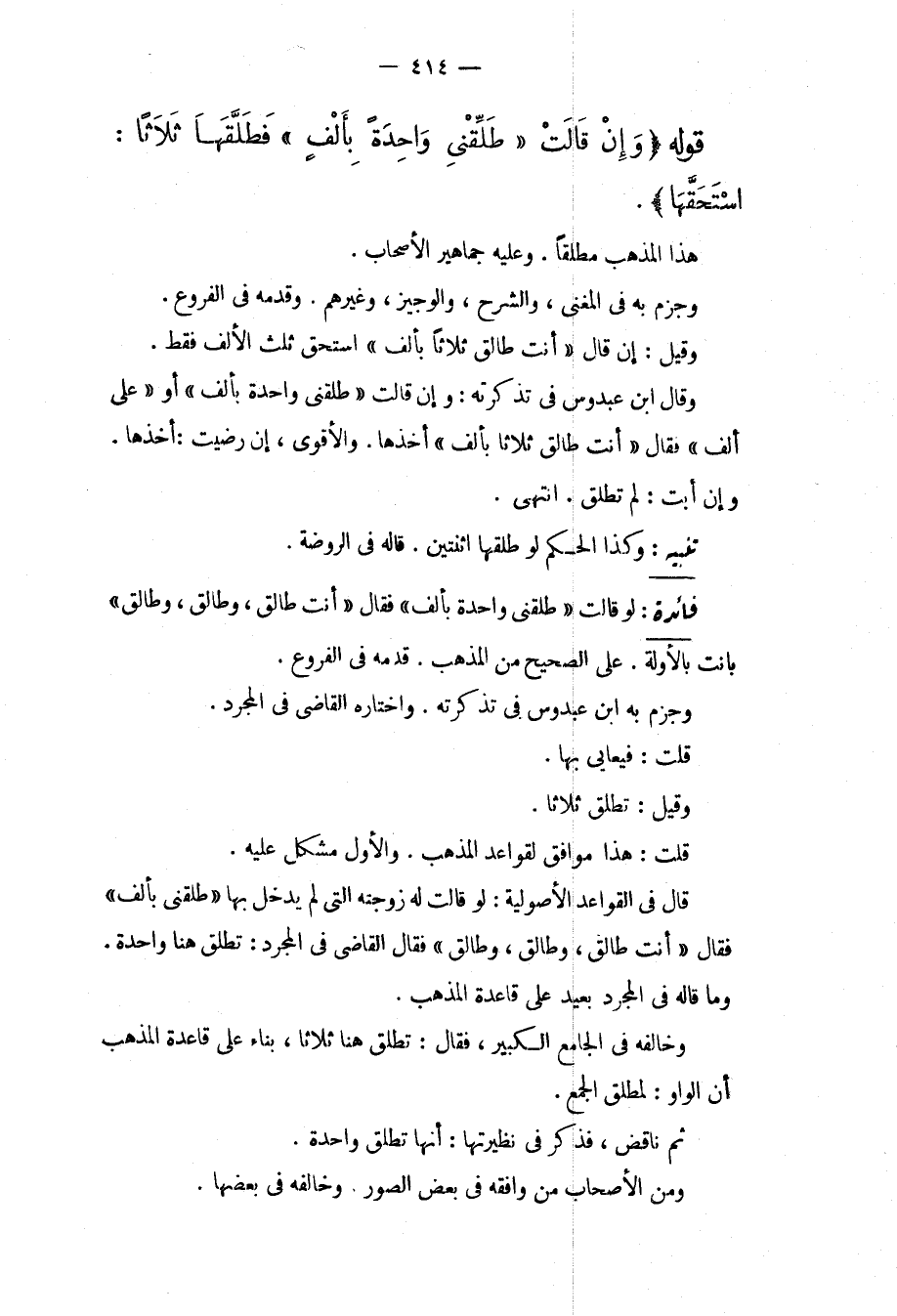 فَائِدَةٌ: لَوْ قَالَتْ " طَلِّقْنِي وَاحِدَةً بِأَلْفٍ " فَقَالَ " أَنْتِ طَالِقٌ، وَطَالِقٌ، وَطَالِقٌ " بَانَتْ بِالْأُولَى. عَلَى الصَّحِيحِ مِنْ الْمَذْهَبِ. قَدَّمَهُ فِي الْفُرُوعِ. وَجَزَمَ بِهِ ابْنُ عَبْدُوسٍ فِي تَذْكِرَتِهِ. وَاخْتَارَهُ الْقَاضِي فِي الْمُجَرَّدِ. قُلْت: فَيُعَايَى بِهَا. وَقِيلَ: تَطْلُقُ ثَلَاثًا. قُلْت: هَذَا مُوَافِقٌ لِقَوَاعِدِ الْمَذْهَبِ وَالْأَوَّلُ مُشْكِلٌ عَلَيْهِ قَالَ فِي الْقَوَاعِدِ الْأُصُولِيَّةِ: لَوْ قَالَتْ لَهُ زَوْجَتُهُ الَّتِي لَمْ يَدْخُلْ بِهَا " طَلِّقْنِي بِأَلْفٍ " فَقَالَ " أَنْتِ طَالِقٌ، وَطَالِقٌ، وَطَالِقٌ " فَقَالَ الْقَاضِي فِي الْمُجَرَّدِ: تَطْلُقُ هُنَا وَاحِدَةً. وَمَا قَالَهُ فِي الْمُجَرَّدِ بَعِيدٌ عَلَى قَاعِدَةِ الْمَذْهَبِ. وَخَالَفَهُ فِي الْجَامِعِ الْكَبِيرِ، فَقَالَ: تَطْلُقُ هُنَا ثَلَاثًا، بِنَاءً عَلَى قَاعِدَةِ الْمَذْهَبِ أَنَّ الْوَاوَ: لِمُطْلَقِ الْجَمْعِ. ثُمَّ نَاقَضَ، فَذَكَرَ فِي نَظِيرَتِهَا: أَنَّهَا تَطْلُقُ وَاحِدَةً. وَمِنْ الْأَصْحَابِ مَنْ وَافَقَهُ فِي بَعْضِ الصُّوَرِ وَخَالَفَهُ فِي بَعْضِهَا.