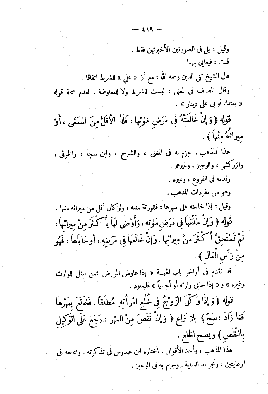 قَوْلُهُ (وَإِنْ خَالَعَتْهُ فِي مَرَضِ مَوْتِهَا: فَلَهُ الْأَقَلُّ مِنْ الْمُسَمَّى، أَوْ مِيرَاثُهُ مِنْهَا) . هَذَا الْمَذْهَبُ. جَزَمَ بِهِ فِي الْمُغْنِي، وَالشَّرْحِ، وَابْنُ مُنَجَّا، وَالْخِرَقِيُّ، وَالزَّرْكَشِيُّ، وَالْوَجِيزُ، وَغَيْرُهُمْ. وَقَدَّمَهُ فِي الْفُرُوعِ، وَغَيْرِهِ. وَهُوَ مِنْ مُفْرَدَاتِ الْمَذْهَبِ. وَقِيلَ: إذَا خَالَعَتْهُ عَلَى مَهْرِهَا: فَلِلْوَرَثَةِ مَنْعُهُ، وَلَوْ كَانَ أَقَلَّ مِنْ مِيرَاثِهِ مِنْهَا.