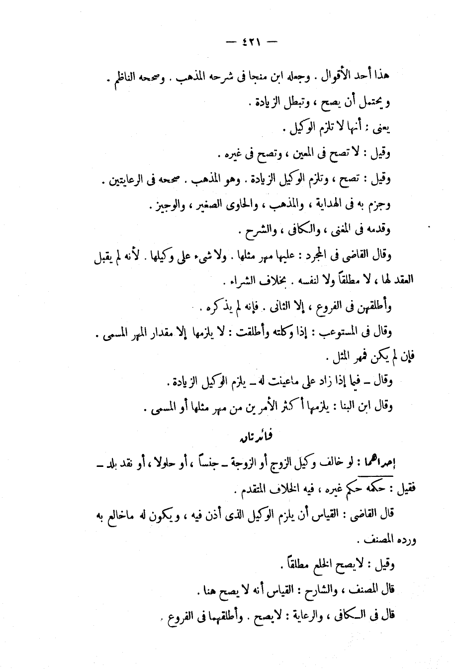 هَذَا أَحَدُ الْأَقْوَالِ. وَجَعَلَهُ ابْنُ مُنَجَّا فِي شَرْحِهِ الْمَذْهَبَ. وَصَحَّحَهُ النَّاظِمُ. وَيَحْتَمِلُ أَنْ يَصِحَّ، وَتَبْطُلَ الزِّيَادَةُ يَعْنِي: أَنَّهَا لَا تَلْزَمُ الْوَكِيلَ. وَقِيلَ: لَا تَصِحُّ فِي الْمُعَيَّنِ، وَتَصِحُّ فِي غَيْرِهِ. وَقِيلَ: تَصِحُّ، وَتَلْزَمُ الْوَكِيلَ الزِّيَادَةُ وَهُوَ الْمَذْهَبُ. صَحَّحَهُ فِي الرِّعَايَتَيْنِ. وَجَزَمَ بِهِ فِي الْهِدَايَةِ، وَالْمُذْهَبِ، وَالْحَاوِي الصَّغِيرِ، وَالْوَجِيزِ. وَقَدَّمَهُ فِي الْمُغْنِي، وَالْكَافِي، وَالشَّرْحِ. وَقَالَ الْقَاضِي فِي الْمُجَرَّدِ: عَلَيْهَا مَهْرُ مِثْلِهَا. وَلَا شَيْءَ عَلَى وَكِيلِهَا؛ لِأَنَّهُ لَمْ يَقْبَلْ الْعَقْدَ لَهَا، لَا مُطْلَقًا وَلَا لِنَفْسِهِ. بِخِلَافِ الشِّرَاءِ. وَأَطْلَقَهُنَّ فِي الْفُرُوعِ، إلَّا الثَّانِيَ. فَإِنَّهُ لَمْ يَذْكُرْهُ. وَقَالَ فِي الْمُسْتَوْعِبِ: إذَا وَكَّلَتْهُ وَأَطْلَقَتْ: لَا يَلْزَمُهَا إلَّا مِقْدَارُ الْمَهْرِ الْمُسَمَّى. فَإِنْ لَمْ يَكُنْ فَمَهْرُ الْمِثْلِ. وَقَالَ فِيمَا إذَا زَادَ عَلَى مَا عَيَّنَتْ لَهُ يَلْزَمُ الْوَكِيلَ الزِّيَادَةُ. وَقَالَ ابْنُ الْبَنَّا: يَلْزَمُهَا أَكْثَرُ الْأَمْرَيْنِ مِنْ مَهْرِ مِثْلِهَا أَوْ الْمُسَمَّى