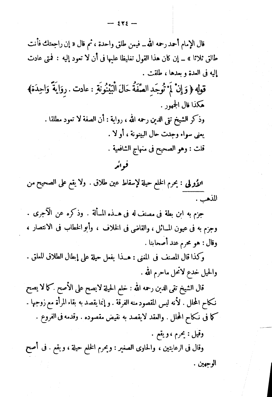 الْأُولَى: يَحْرُمُ الْخُلْعُ حِيلَةً لِإِسْقَاطِ عَيْنِ طَلَاقٍ. وَلَا يَقَعُ عَلَى الصَّحِيحِ مِنْ الْمَذْهَبِ. جَزَمَ بِهِ ابْنُ بَطَّةَ فِي مُصَنَّفٍ لَهُ فِي هَذِهِ الْمَسْأَلَةِ. وَذَكَرَهُ عَنْ الْآجُرِّيِّ. وَجَزَمَ بِهِ فِي عُيُونِ الْمَسَائِلِ، وَالْقَاضِي فِي الْخِلَافِ، وَأَبُو الْخَطَّابِ فِي الِانْتِصَارِ، وَقَالَ: هُوَ مُحَرَّمٌ عِنْدَ أَصْحَابِنَا. وَكَذَا قَالَ الْمُصَنِّفُ فِي الْمُغْنِي: هَذَا يُفْعَلُ حِيلَةً عَلَى إبْطَالِ الطَّلَاقِ الْمُعَلَّقِ. وَالْحِيَلُ خُدَعٌ لَا تُحِلُّ مَا حَرَّمَ اللَّهُ. قَالَ الشَّيْخُ تَقِيُّ الدِّينِ - رَحِمَهُ اللَّهُ -: خُلْعُ الْحِيلَةِ لَا يَصِحُّ عَلَى الْأَصَحِّ كَمَا لَا يَصِحُّ نِكَاحُ الْمُحَلِّلِ؛ لِأَنَّهُ لَيْسَ الْمَقْصُودُ مِنْهُ الْفُرْقَةَ. وَإِنَّمَا قَصَدَ بِهِ بَقَاءَ الْمَرْأَةِ مَعَ زَوْجِهَا. كَمَا فِي نِكَاحِ الْمُحَلِّلِ. وَالْعَقْدُ لَا يُقْصَدُ بِهِ نَقِيضُ مَقْصُودِهِ. وَقَدَّمَهُ فِي الْفُرُوعِ. وَقِيلَ: يَحْرُمُ، وَيَقَعُ. وَقَالَ فِي الرِّعَايَتَيْنِ، وَالْحَاوِي الصَّغِيرِ: وَيَحْرُمُ الْخُلْعُ حِيلَةً، وَيَقَعُ فِي أَصَحِّ الْوَجْهَيْنِ.