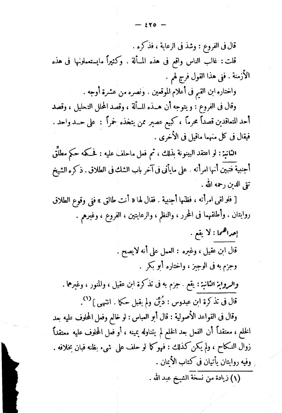 قَالَ فِي الْفُرُوعِ: وَشَذَّ فِي الرِّعَايَةِ، فَذَكَرَهُ. قُلْت: غَالِبُ النَّاسِ وَاقِعٌ فِي هَذِهِ الْمَسْأَلَةِ. وَكَثِيرًا مَا يَسْتَعْمِلُونَهَا فِي هَذِهِ الْأَزْمِنَةِ. فَفِي هَذَا الْقَوْلِ فَرَجٌ لَهُمْ. وَاخْتَارَهُ ابْنُ الْقَيِّمِ فِي إعْلَامِ الْمُوَقِّعِينَ. وَنَصَرَهُ مِنْ عَشَرَةِ أَوْجُهٍ.