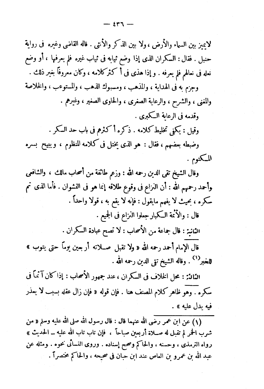 الثَّانِيَةُ: قَالَ جَمَاعَةٌ مِنْ الْأَصْحَابِ: لَا تَصِحُّ عِبَادَةُ السَّكْرَانِ. قَالَ الْإِمَامُ أَحْمَدُ - رَحِمَهُ اللَّهُ - " وَلَا تُقْبَلُ صَلَاتُهُ أَرْبَعِينَ يَوْمًا حَتَّى يَتُوبَ " لِلْخَبَرِ. وَقَالَهُ الشَّيْخُ تَقِيُّ الدِّينِ - رَحِمَهُ اللَّهُ -.