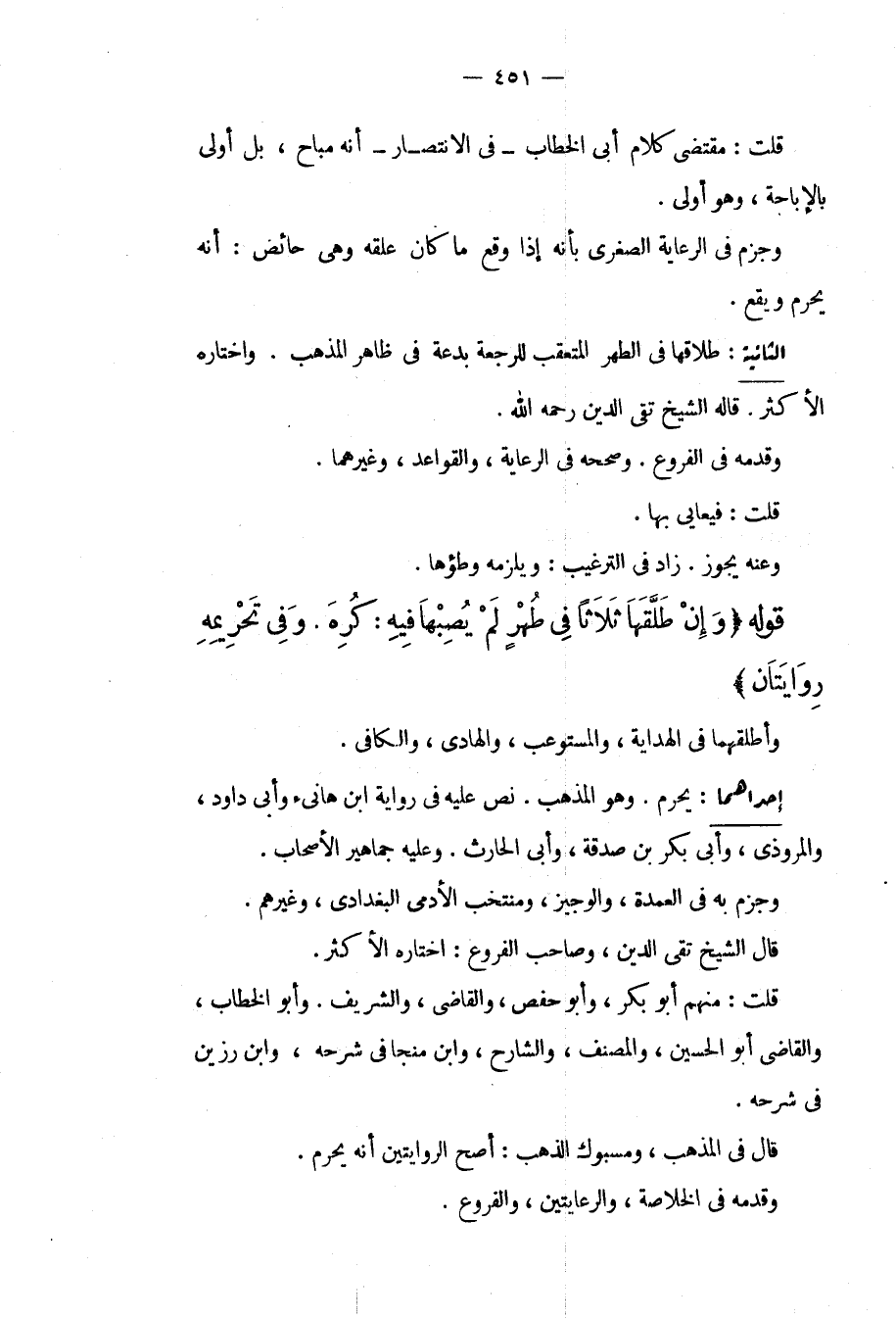 قُلْت: مُقْتَضَى كَلَامِ أَبِي الْخَطَّابِ فِي الِانْتِصَارِ أَنَّهُ مُبَاحٌ، بَلْ أَوْلَى بِالْإِبَاحَةِ، وَهُوَ أَوْلَى. وَجَزَمَ فِي الرِّعَايَةِ الصُّغْرَى بِأَنَّهُ إذَا وَقَعَ مَا كَانَ عَلَّقَهُ وَهِيَ حَائِضٌ: أَنَّهُ يَحْرُمُ وَيَقَعُ. الثَّانِيَةُ: طَلَاقُهَا فِي الطُّهْرِ الْمُتَعَقِّبِ لِلرَّجْعَةِ بِدْعَةٌ فِي ظَاهِرِ الْمَذْهَبِ. وَاخْتَارَهُ الْأَكْثَرُ. قَالَهُ الشَّيْخُ تَقِيُّ الدِّينِ - رَحِمَهُ اللَّهُ -. وَقَدَّمَهُ فِي الْفُرُوعِ. وَصَحَّحَهُ فِي الرِّعَايَةِ، وَالْقَوَاعِدِ، وَغَيْرِهِمَا. قُلْت: فَيُعَايَى بِهَا. وَعَنْهُ يَجُوزُ. زَادَ فِي التَّرْغِيبِ: وَيَلْزَمُهُ وَطْؤُهَا.