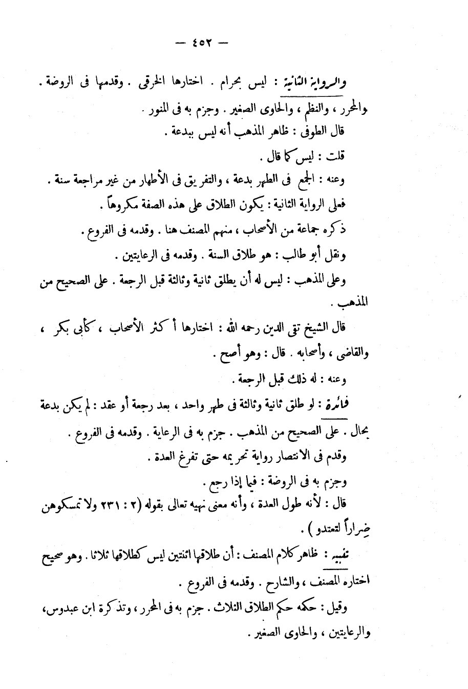 وَالرِّوَايَةُ الثَّانِيَةُ: لَيْسَ بِحَرَامٍ. اخْتَارَهَا الْخِرَقِيُّ. وَقَدَّمَهَا فِي الرَّوْضَةِ. وَالْمُحَرَّرِ، وَالنَّظْمِ، وَالْحَاوِي الصَّغِيرِ. وَجَزَمَ بِهِ فِي الْمُنَوِّرِ. قَالَ الطُّوفِيُّ: ظَاهِرُ الْمَذْهَبِ أَنَّهُ لَيْسَ بِبِدْعَةٍ. قُلْت: لَيْسَ كَمَا قَالَ. وَعَنْهُ: الْجَمْعُ فِي الطُّهْرِ بِدْعَةٌ، وَالتَّفْرِيقُ فِي الْأَطْهَارِ مِنْ غَيْرِ مُرَاجَعَةٍ سُنَّةٌ. فَعَلَى الرِّوَايَةِ الثَّانِيَةِ: يَكُونُ الطَّلَاقُ عَلَى هَذِهِ الصِّفَةِ مَكْرُوهًا. ذَكَرَهُ جَمَاعَةٌ مِنْ الْأَصْحَابِ، مِنْهُمْ الْمُصَنِّفُ هُنَا. وَقَدَّمَهُ فِي الْفُرُوعِ. وَنَقَلَ أَبُو طَالِبٍ: هُوَ طَلَاقُ السُّنَّةِ. وَقَدَّمَهُ فِي الرِّعَايَتَيْنِ. وَعَلَى الْمَذْهَبِ: لَيْسَ لَهُ أَنْ يُطَلِّقَ ثَانِيَةً وَثَالِثَةً قَبْلَ الرَّجْعَةِ. عَلَى الصَّحِيحِ مِنْ الْمَذْهَبِ. قَالَ الشَّيْخُ تَقِيُّ الدِّينِ - رَحِمَهُ اللَّهُ -: اخْتَارَهَا أَكْثَرُ الْأَصْحَابِ، كَأَبِي بَكْرٍ، وَالْقَاضِي، وَأَصْحَابِهِ. قَالَ: وَهُوَ أَصَحُّ. وَعَنْهُ: لَهُ ذَلِكَ قَبْلَ الرَّجْعَةِ.