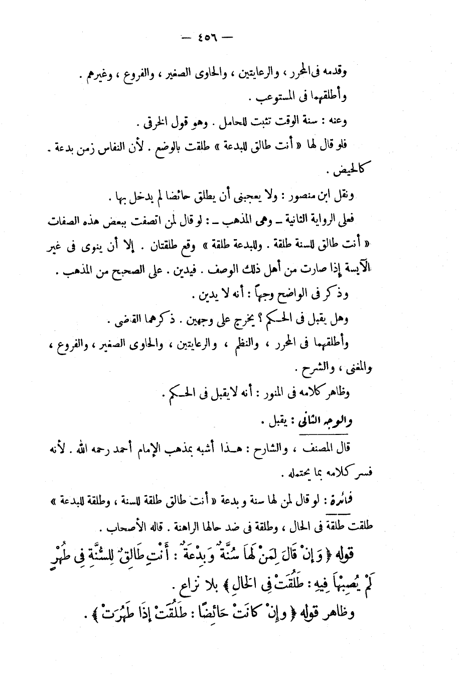 وَقَدَّمَهُ فِي الْمُحَرَّرِ، وَالرِّعَايَتَيْنِ، وَالْحَاوِي الصَّغِيرِ، وَالْفُرُوعِ، وَغَيْرِهِمْ. وَأَطْلَقَهُمَا فِي الْمُسْتَوْعِبِ. وَعَنْهُ: سُنَّةُ الْوَقْتِ تَثْبُتُ لِلْحَامِلِ. وَهُوَ قَوْلُ الْخِرَقِيِّ. فَلَوْ قَالَ لَهَا " أَنْتِ طَالِقٌ لِلْبِدْعَةِ " طَلُقَتْ بِالْوَضْعِ؛ لِأَنَّ النِّفَاسَ زَمَنُ بِدْعَةٍ. كَالْحَيْضِ. وَنَقَلَ ابْنُ مَنْصُورٍ: وَلَا يُعْجِبُنِي أَنْ يُطَلِّقَ حَائِضًا لَمْ يَدْخُلْ بِهَا. فَعَلَى الرِّوَايَةِ الثَّانِيَةِ وَهِيَ الْمَذْهَبُ: لَوْ قَالَ لِمَنْ اتَّصَفَتْ بِبَعْضِ هَذِهِ الصِّفَاتِ " أَنْتِ طَالِقٌ لِلسُّنَّةِ طَلْقَةً. وَلِلْبِدْعَةِ طَلْقَةً " وَقَعَ طَلْقَتَانِ. إلَّا أَنْ يَنْوِيَ فِي غَيْرِ الْآيِسَةِ إذَا صَارَتْ مِنْ أَهْلِ ذَلِكَ الْوَصْفِ. فَيُدَيَّنُ. عَلَى الصَّحِيحِ مِنْ الْمَذْهَبِ. وَذَكَرَ فِي الْوَاضِحِ وَجْهًا: أَنَّهُ لَا يَدِينُ. وَهَلْ يُقْبَلُ فِي الْحُكْمِ؟ يُخَرَّجُ عَلَى وَجْهَيْنِ. ذَكَرَهُمَا الْقَاضِي. وَأَطْلَقَهُمَا فِي الْمُحَرَّرِ، وَالنَّظْمِ، وَالرِّعَايَتَيْنِ، وَالْحَاوِي الصَّغِيرِ، وَالْفُرُوعِ، وَالْمُغْنِي، وَالشَّرْحِ. وَظَاهِرُ كَلَامِهِ فِي الْمُنَوِّرِ: أَنَّهُ لَا يُقْبَلُ فِي الْحُكْمِ.