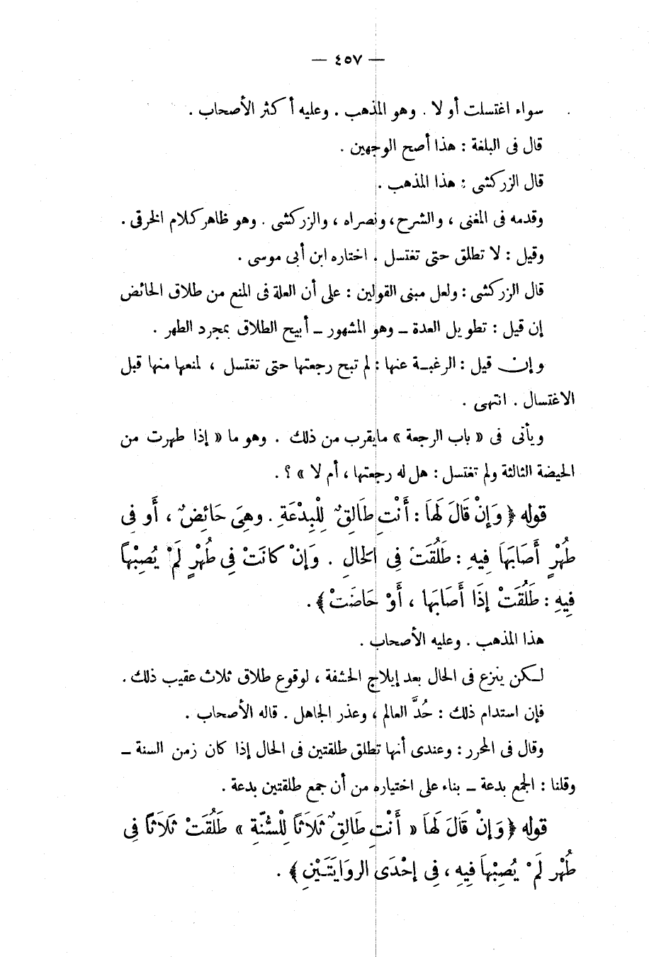 سَوَاءٌ اغْتَسَلَتْ أَوْ لَا. وَهُوَ الْمَذْهَبُ. وَعَلَيْهِ أَكْثَرُ الْأَصْحَابِ. قَالَ فِي الْبُلْغَةِ: هَذَا أَصَحُّ الْوَجْهَيْنِ. قَالَ الزَّرْكَشِيُّ هَذَا الْمَذْهَبُ. وَقَدَّمَهُ فِي الْمُغْنِي، وَالشَّرْحِ، وَنَصَرَاهُ، وَالزَّرْكَشِيُّ. وَهُوَ ظَاهِرُ كَلَامِ الْخِرَقِيِّ. وَقِيلَ: لَا تَطْلُقُ حَتَّى تَغْتَسِلَ. اخْتَارَهُ ابْنُ أَبِي مُوسَى. قَالَ الزَّرْكَشِيُّ: وَلَعَلَّ مَبْنَى الْقَوْلَيْنِ: عَلَى أَنَّ الْعِلَّةَ فِي الْمَنْعِ مِنْ طَلَاقِ الْحَائِضِ إنْ قِيلَ: تَطْوِيلُ الْعِدَّةِ وَهُوَ الْمَشْهُورُ أُبِيحَ الطَّلَاقُ بِمُجَرَّدِ الطُّهْرِ. وَإِنْ قِيلَ: الرَّغْبَةُ عَنْهَا: لَمْ تُبِحْ رَجْعَتُهَا حَتَّى تَغْتَسِلَ، لِمَنْعِهَا مِنْهَا قَبْلَ الِاغْتِسَالِ. انْتَهَى وَيَأْتِي فِي " بَابِ الرَّجْعَةِ " مَا يَقْرُبُ مِنْ ذَلِكَ. وَهُوَ مَا " إذَا طَهُرَتْ مِنْ الْحَيْضَةِ الثَّالِثَةِ وَلَمْ تَغْتَسِلْ: هَلْ لَهُ رَجْعَتُهَا، أَمْ لَا "؟ .