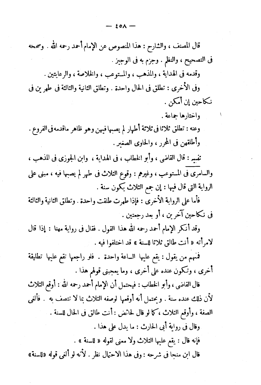 قَالَ الْقَاضِي، وَأَبُو الْخَطَّابِ، فِي الْهِدَايَةِ، وَابْنُ الْجَوْزِيِّ فِي الْمُذْهَب، وَالسَّامِرِيُّ فِي الْمُسْتَوْعِبِ، وَغَيْرُهُمْ: وُقُوعُ الثَّلَاثِ فِي طُهْرٍ لَمْ يُصِبْهَا فِيهِ، مَبْنِيٌّ عَلَى الرِّوَايَةِ الَّتِي قَالَ فِيهَا: إنَّ جَمْعَ الثَّلَاثِ يَكُونُ سُنَّةً. فَأَمَّا عَلَى الرِّوَايَةِ الْأُخْرَى: فَإِذَا طَهُرَتْ طَلُقَتْ وَاحِدَةً. وَتَطْلُقُ الثَّانِيَةَ وَالثَّالِثَةَ فِي نِكَاحَيْنِ آخَرَيْنِ، أَوْ بَعْدَ رَجْعَتَيْنِ. وَقَدْ أَنْكَرَ الْإِمَامُ أَحْمَدُ - رَحِمَهُ اللَّهُ - هَذَا الْقَوْلَ. فَقَالَ فِي رِوَايَةِ مُهَنَّا: إذَا قَالَ لِامْرَأَتِهِ " أَنْتِ طَالِقٌ ثَلَاثًا لِلسُّنَّةِ " قَدْ اخْتَلَفُوا فِيهِ. فَمِنْهُمْ مَنْ يَقُولُ: يَقَعُ عَلَيْهَا السَّاعَةَ وَاحِدَةٌ. فَلَوْ رَاجَعَهَا تَقَعُ عَلَيْهَا تَطْلِيقَةٌ أُخْرَى، وَتَكُونُ عِنْدَهُ عَلَى أُخْرَى، وَمَا يُعْجِبُنِي قَوْلُهُمْ هَذَا. قَالَ الْقَاضِي، وَأَبُو الْخَطَّابِ: فَيَحْتَمِلُ أَنَّ الْإِمَامَ أَحْمَدَ - رَحِمَهُ اللَّهُ -: أَوْقَعَ الثَّلَاثَ لِأَنَّ ذَلِكَ عِنْدَهُ سُنَّةٌ. وَيَحْتَمِلُ أَنَّهُ أَوْقَعَهَا لِوَصْفِهِ الثَّلَاثَ بِمَا لَا تَتَّصِفُ بِهِ. فَأَلْغَى الصِّفَةَ، وَأَوْقَعَ الثَّلَاثَ كَمَا لَوْ قَالَ لِحَائِضٍ: أَنْتِ طَالِقٌ فِي الْحَالِ لِلسُّنَّةِ. وَقَالَ فِي رِوَايَةِ أَبِي الْحَارِثِ: مَا يَدُلُّ عَلَى هَذَا. فَإِنَّهُ قَالَ: يَقَعُ عَلَيْهَا الثَّلَاثُ وَلَا مَعْنَى لِقَوْلِهِ " لِلسُّنَّةِ ". قَالَ ابْنُ مُنَجَّا فِي شَرْحِهِ: وَفِي هَذَا الِاحْتِمَالِ نَظَرٌ؛ لِأَنَّهُ لَوْ أَلْغَى قَوْلَهُ " لِلسُّنَّةِ "