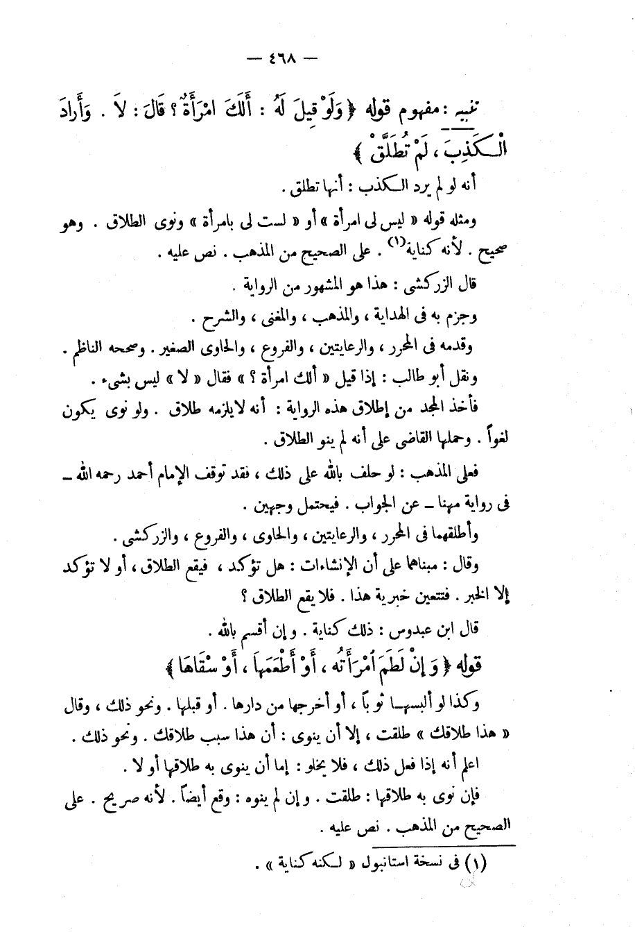 مَفْهُومُ قَوْلِهِ (وَلَوْ قِيلَ لَهُ: أَلَك امْرَأَةٌ؟ قَالَ: لَا. وَأَرَادَ الْكَذِبَ، لَمْ تَطْلُقْ) أَنَّهُ لَوْ لَمْ يُرِدْ الْكَذِبَ: أَنَّهَا تَطْلُقُ. وَمِثْلُهُ قَوْلُهُ " لَيْسَ لِي امْرَأَةٌ " أَوْ " لَسْتِ لِي بِامْرَأَةٍ " وَنَوَى الطَّلَاقَ. وَهُوَ صَحِيحٌ؛ لِأَنَّهُ كِنَايَةٌ. عَلَى الصَّحِيحِ مِنْ الْمَذْهَبِ. نَصَّ عَلَيْهِ. قَالَ الزَّرْكَشِيُّ: هَذَا هُوَ الْمَشْهُورُ مِنْ الرِّوَايَةِ. وَجَزَمَ بِهِ فِي الْهِدَايَةِ، وَالْمُذْهَبِ، وَالْمُغْنِي، وَالشَّرْحِ. وَقَدَّمَهُ فِي الْمُحَرَّرِ، وَالرِّعَايَتَيْنِ، وَالْفُرُوعِ، وَالْحَاوِي الصَّغِيرِ. وَصَحَّحَهُ النَّاظِمُ. وَنَقَلَ أَبُو طَالِبٍ: إذَا قِيلَ " أَلَك امْرَأَةٌ؟ " فَقَالَ " لَا " لَيْسَ بِشَيْءٍ. فَأَخَذَ الْمَجْدُ مِنْ إطْلَاقِ هَذِهِ الرِّوَايَةِ: أَنَّهُ لَا يَلْزَمُهُ طَلَاقٌ. وَلَوْ نَوَى يَكُونُ لَغْوًا. وَحَمَلَهَا الْقَاضِي عَلَى أَنَّهُ لَمْ يَنْوِ الطَّلَاقَ. فَعَلَى الْمَذْهَبِ: لَوْ حَلَفَ بِاَللَّهِ عَلَى ذَلِكَ، فَقَدْ تَوَقَّفَ الْإِمَامُ أَحْمَدُ - رَحِمَهُ اللَّهُ - فِي رِوَايَةِ مُهَنَّا عَنْ الْجَوَابِ. فَيَحْتَمِلُ وَجْهَيْنِ. وَأَطْلَقَهُمَا فِي الْمُحَرَّرِ، وَالرِّعَايَتَيْنِ، وَالْحَاوِي، وَالْفُرُوعِ، وَالزَّرْكَشِيِّ. وَقَالَ: مَبْنَاهُمَا عَلَى أَنَّ الْإِنْشَاءَاتِ: هَلْ تُؤَكِّدُ، فَيَقَعُ الطَّلَاقُ، أَوْ لَا تُؤَكِّدُ إلَّا الْخَبَرَ. فَتَتَعَيَّنُ خَبَرِيَّةُ هَذَا. فَلَا يَقَعُ الطَّلَاقُ؟ قَالَ ابْنُ عَبْدُوسٍ: ذَلِكَ كِنَايَةٌ. وَإِنْ أَقْسَمَ بِاَللَّهِ.