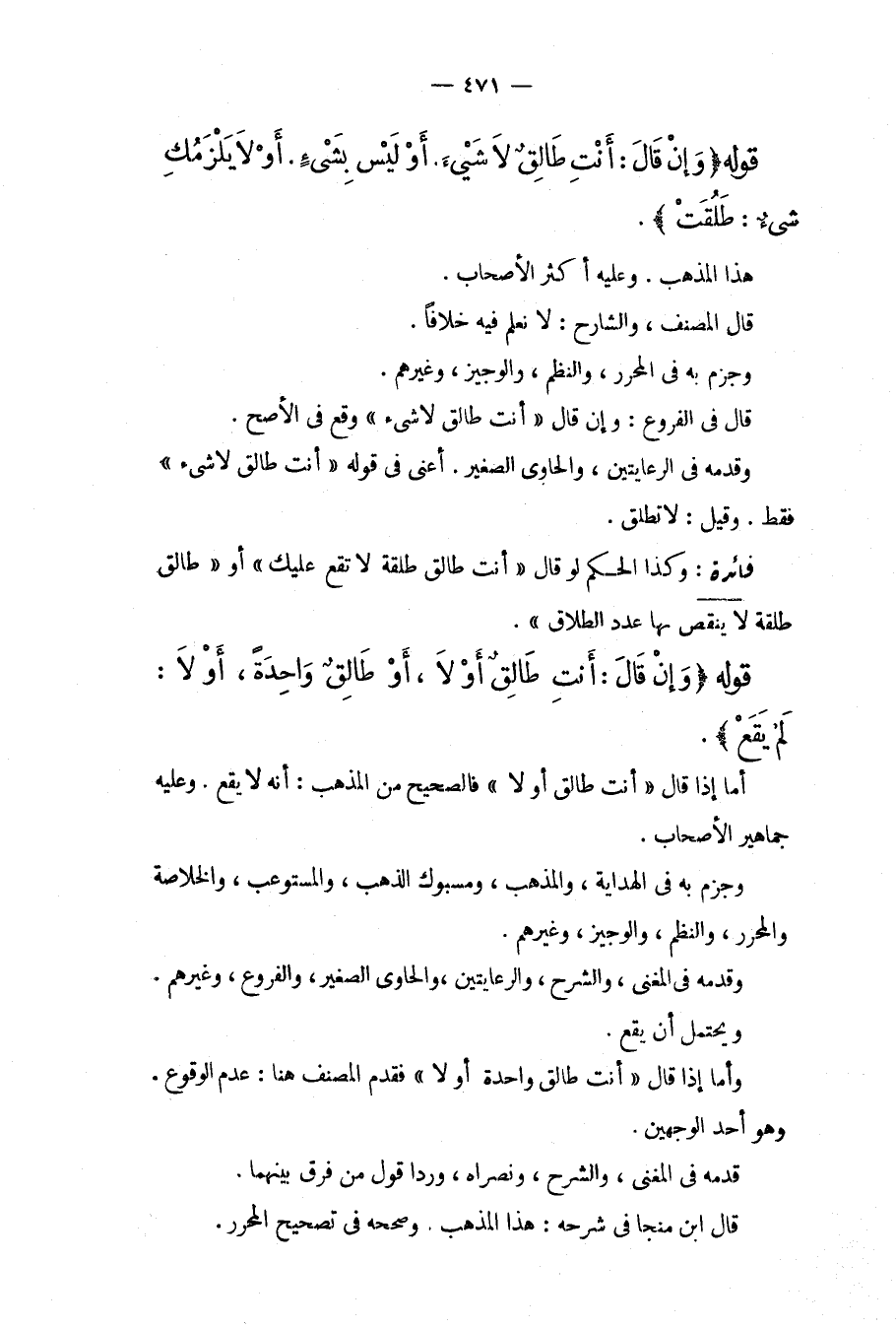 قَوْلُهُ (وَإِنْ قَالَ: أَنْتِ طَالِقٌ لَا شَيْءَ. أَوْ لَيْسَ بِشَيْءٍ. أَوْ لَا يَلْزَمُك شَيْءٌ: طَلُقَتْ) . هَذَا الْمَذْهَبُ. وَعَلَيْهِ أَكْثَرُ الْأَصْحَابِ. قَالَ الْمُصَنِّفُ، وَالشَّارِحُ: لَا نَعْلَمُ فِيهِ خِلَافًا. وَجَزَمَ بِهِ فِي الْمُحَرَّرِ، وَالنَّظْمِ، وَالْوَجِيزِ، وَغَيْرِهِمْ. قَالَ فِي الْفُرُوعِ: وَإِنْ قَالَ " أَنْتِ طَالِقٌ لَا شَيْءَ " وَقَعَ فِي الْأَصَحِّ. وَقَدَّمَهُ فِي الرِّعَايَتَيْنِ، وَالْحَاوِي الصَّغِيرِ. أَعْنِي فِي قَوْلِهِ " أَنْتِ طَالِقٌ لَا شَيْءَ " فَقَطْ. وَقِيلَ: لَا تَطْلُقُ.