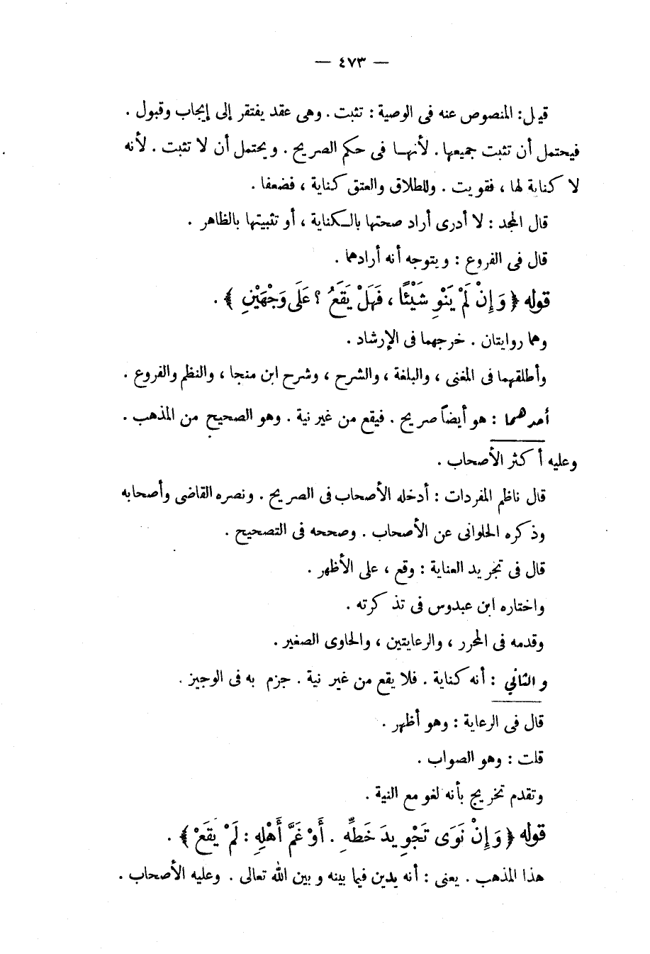 قِيلَ: الْمَنْصُوصُ عَنْهُ فِي الْوَصِيَّةِ: تَثْبُتُ. وَهِيَ عَقْدٌ يَفْتَقِرُ إلَى إيجَابٍ وَقَبُولٍ. فَيَحْتَمِلُ أَنْ تَثْبُتَ جَمِيعُهَا. لِأَنَّهَا فِي حُكْمِ الصَّرِيحِ. وَيَحْتَمِلُ أَنْ لَا تَثْبُتَ؛ لِأَنَّهُ لَا كِنَايَةَ لَهَا، فَقَوِيَتْ. وَلِلطَّلَاقِ وَالْعِتْقِ كِنَايَةٌ، فَضَعُفَا. قَالَ الْمَجْدُ: لَا أَدْرِي أَرَادَ صِحَّتَهَا بِالْكِنَايَةِ، أَوْ تَثْبِيتَهَا بِالظَّاهِرِ. قَالَ فِي الْفُرُوعِ: وَيَتَوَجَّهُ أَنَّهُ أَرَادَهُمَا. قَوْلُهُ (وَإِنْ لَمْ يَنْوِ شَيْئًا، فَهَلْ يَقَعُ؟ عَلَى وَجْهَيْنِ) . وَهُمَا رِوَايَتَانِ. خَرَّجَهُمَا فِي الْإِرْشَادِ. وَأَطْلَقَهُمَا فِي الْمُغْنِي، وَالْبُلْغَةِ، وَالشَّرْحِ، وَشَرْحِ ابْنِ مُنَجَّا، وَالنَّظْمِ وَالْفُرُوعِ.