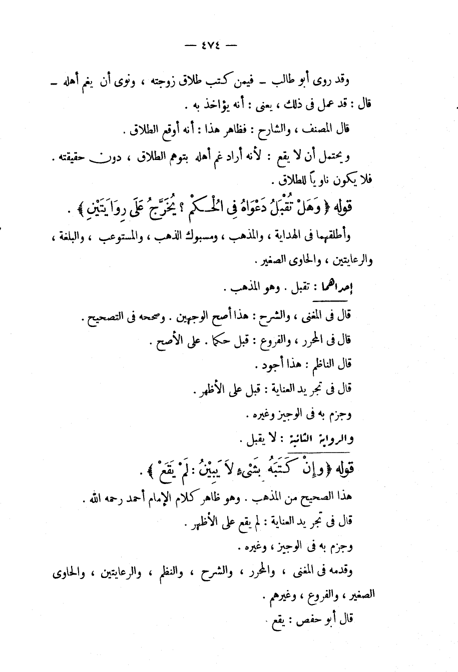 وَقَدْ رَوَى أَبُو طَالِبٍ فِيمَنْ كَتَبَ طَلَاقَ زَوْجَتِهِ، وَنَوَى أَنْ يَغُمَّ أَهْلَهُ قَالَ: قَدْ عَمِلَ فِي ذَلِكَ، يَعْنِي: أَنَّهُ يُؤَاخَذُ بِهِ. قَالَ الْمُصَنِّفُ، وَالشَّارِحُ: فَظَاهِرُ هَذَا: أَنَّهُ أَوْقَعَ الطَّلَاقَ. وَيَحْتَمِلُ أَنْ لَا يَقَعَ: لِأَنَّهُ أَرَادَ غَمَّ أَهْلِهِ بِتَوَهُّمِ الطَّلَاقِ، دُونَ حَقِيقَتِهِ. فَلَا يَكُونُ نَاوِيًا لِلطَّلَاقِ. قَوْلُهُ (وَهَلْ تُقْبَلُ دَعْوَاهُ فِي الْحُكْمِ؟ يُخَرَّجُ عَلَى رِوَايَتَيْنِ) . وَأَطْلَقَهُمَا فِي الْهِدَايَةِ، وَالْمُذْهَبِ، وَمَسْبُوكِ الذَّهَبِ، وَالْمُسْتَوْعِبِ، وَالْبُلْغَةِ، وَالرِّعَايَتَيْنِ، وَالْحَاوِي الصَّغِيرِ.