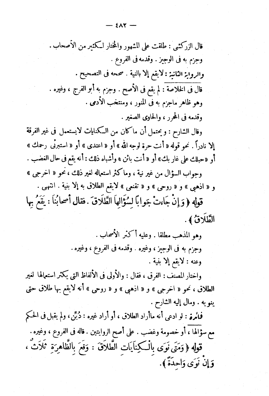 وَالرِّوَايَةُ الثَّانِيَةُ: لَا يَقَعُ إلَّا بِالنِّيَّةِ. صَحَّحَهُ فِي التَّصْحِيحِ. قَالَ فِي الْخُلَاصَةِ: لَمْ يَقَعْ فِي الْأَصَحِّ. وَجَزَمَ بِهِ أَبُو الْفَرَجِ، وَغَيْرُهُ. وَهُوَ ظَاهِرُ مَا جَزَمَ بِهِ فِي الْمُنَوِّرِ، وَمُنْتَخَبِ الْأَدَمِيِّ. وَقَدَّمَهُ فِي الْمُحَرَّرِ، وَالْحَاوِي الصَّغِيرِ. وَقَالَ الشَّارِحُ: وَيُحْتَمَلُ أَنَّ مَا كَانَ مِنْ الْكِنَايَاتِ لَا يُسْتَعْمَلُ فِي غَيْرِ الْفُرْقَةِ إلَّا نَادِرًا. نَحْوَ قَوْلِهِ " أَنْتِ حُرَّةٌ لِوَجْهِ اللَّهِ " أَوْ " اعْتَدِّي " أَوْ " اسْتَبْرِئِي رَحِمَك " أَوْ " حَبْلُك عَلَى غَارِبِك " أَوْ " أَنْتِ بَائِنٌ " وَأَشْبَاهُ ذَلِكَ: أَنَّهُ يَقَعُ فِي حَالِ الْغَضَبِ. وَجَوَابُ السُّؤَالِ مِنْ غَيْرِ نِيَّةٍ، وَمَا كَثُرَ اسْتِعْمَالُهُ لِغَيْرِ ذَلِكَ، نَحْوَ " اُخْرُجِي " وَ " اذْهَبِي " وَ " رُوحِي " وَ " تَقَنَّعِي " لَا يَقَعُ الطَّلَاقُ بِهِ إلَّا بِنِيَّةٍ. انْتَهَى.