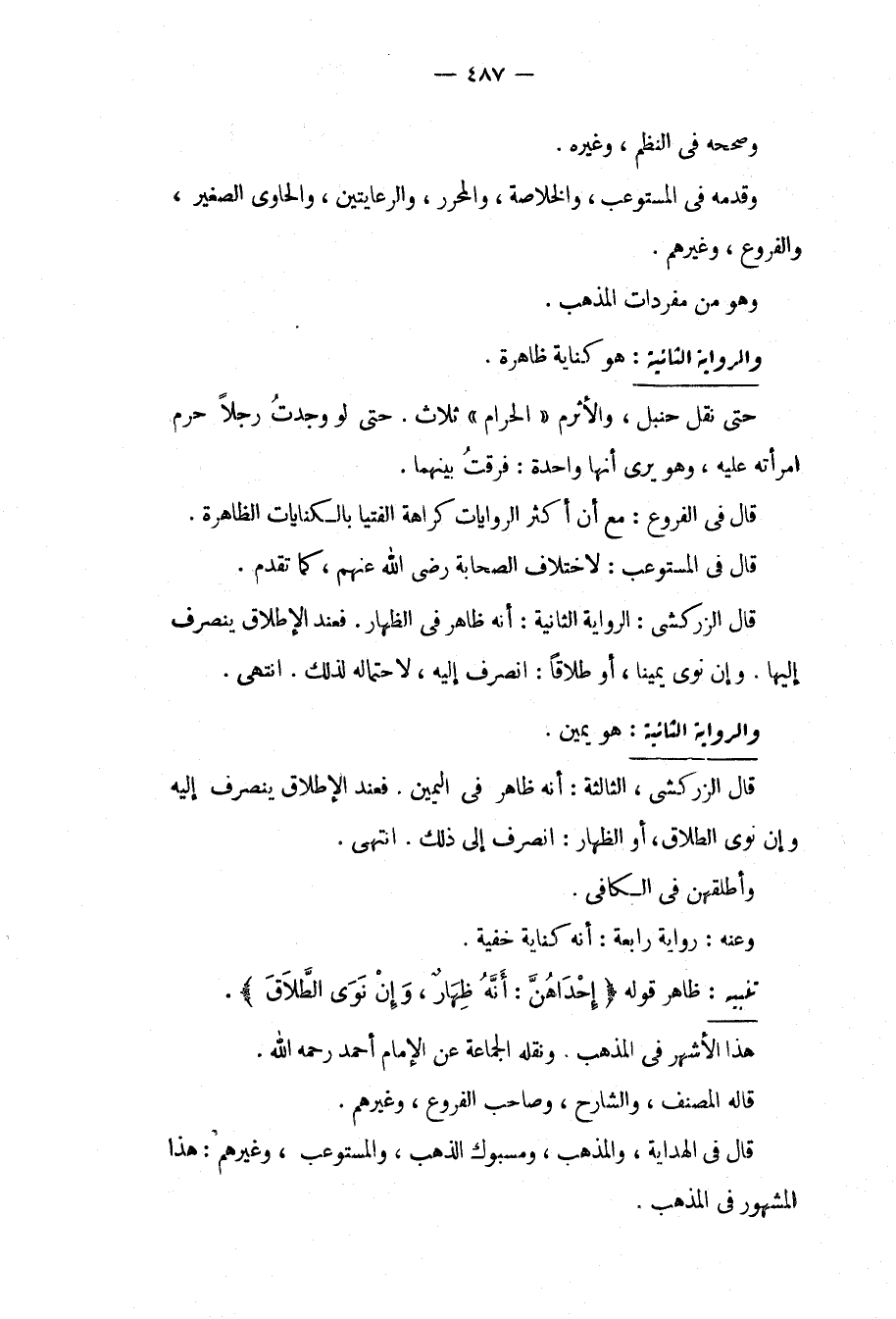 وَالرِّوَايَةُ الثَّانِيَةُ: هُوَ كِنَايَةٌ ظَاهِرَةٌ. حَتَّى نَقَلَ حَنْبَلٌ، وَالْأَثْرَمُ " الْحَرَامَ " ثَلَاثٌ. حَتَّى لَوْ وَجَدْت رَجُلًا حَرَّمَ امْرَأَتَهُ عَلَيْهِ، وَهُوَ يَرَى أَنَّهَا وَاحِدَةٌ: فَرَّقْت بَيْنَهُمَا. قَالَ فِي الْفُرُوعِ: مَعَ أَنَّ أَكْثَرَ الرِّوَايَاتِ كَرَاهَةُ الْفُتْيَا بِالْكِنَايَاتِ الظَّاهِرَةِ. قَالَ فِي الْمُسْتَوْعِبِ: لِاخْتِلَافِ الصَّحَابَةِ - رَضِيَ اللَّهُ عَنْهُمْ -، كَمَا تَقَدَّمَ. قَالَ الزَّرْكَشِيُّ: الرِّوَايَةُ الثَّانِيَةُ: أَنَّهُ ظَاهِرٌ فِي الظِّهَارِ. فَعِنْدَ الْإِطْلَاقِ يَنْصَرِفُ إلَيْهَا. وَإِنْ نَوَى يَمِينًا، أَوْ طَلَاقًا: انْصَرَفَ إلَيْهِ، لِاحْتِمَالِهِ لِذَلِكَ. انْتَهَى.