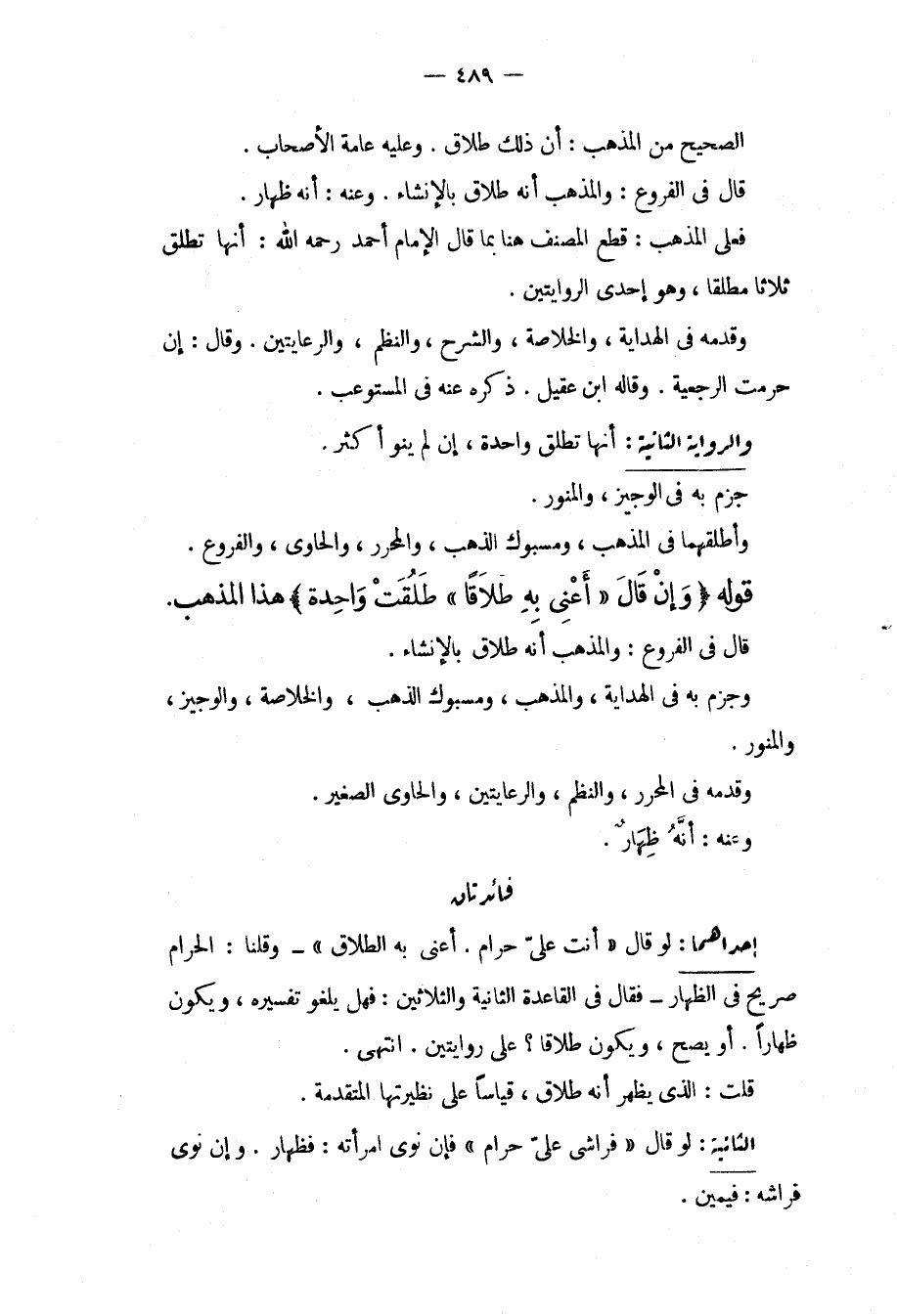 الصَّحِيحُ مِنْ الْمَذْهَبِ: أَنَّ ذَلِكَ طَلَاقٌ. وَعَلَيْهِ عَامَّةُ الْأَصْحَابِ. قَالَ فِي الْفُرُوعِ: وَالْمُذْهَبِ أَنَّهُ طَلَاقٌ بِالْإِنْشَاءِ. وَعَنْهُ: أَنَّهُ ظِهَارٌ. فَعَلَى الْمَذْهَبِ: قَطَعَ الْمُصَنِّفُ هُنَا بِمَا قَالَ الْإِمَامُ أَحْمَدُ - رَحِمَهُ اللَّهُ -: أَنَّهَا تَطْلُقُ ثَلَاثًا مُطْلَقًا، وَهُوَ إحْدَى الرِّوَايَتَيْنِ. وَقَدَّمَهُ فِي الْهِدَايَةِ، وَالْخُلَاصَةِ، وَالشَّرْحِ، وَالنَّظْمِ، وَالرِّعَايَتَيْنِ. وَقَالَ: إنْ حَرُمَتْ الرَّجْعِيَّةُ. وَقَالَهُ ابْنُ عَقِيلٍ. ذَكَرَهُ عَنْهُ فِي الْمُسْتَوْعِبِ.