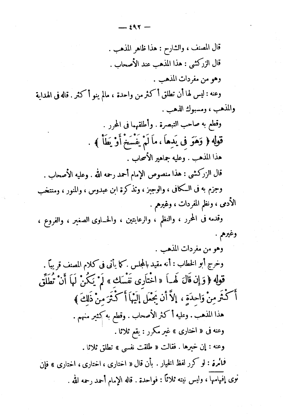 قَالَ الْمُصَنِّفُ، وَالشَّارِحُ: هَذَا ظَاهِرُ الْمَذْهَبِ. قَالَ الزَّرْكَشِيُّ: هَذَا الْمَذْهَبُ عِنْدَ الْأَصْحَابِ. وَهُوَ مِنْ مُفْرَدَاتِ الْمَذْهَبِ. وَعَنْهُ: لَيْسَ لَهَا أَنْ تُطَلِّقَ أَكْثَرَ مِنْ وَاحِدَةٍ، مَا لَمْ يَنْوِ أَكْثَرَ. قَالَهُ فِي الْهِدَايَةِ وَالْمُذْهَبِ، وَمَسْبُوكِ الذَّهَبِ. وَقَطَعَ بِهِ صَاحِبُ التَّبْصِرَةِ. وَأَطْلَقَهُمَا فِي الْمُحَرَّرِ. قَوْلُهُ (وَهُوَ فِي يَدِهَا، مَا لَمْ يَفْسَخْ أَوْ يَطَأْ) . هَذَا الْمَذْهَبُ. وَعَلَيْهِ جَمَاهِيرُ الْأَصْحَابِ. قَالَ الزَّرْكَشِيُّ: هَذَا مَنْصُوصُ الْإِمَامِ أَحْمَدَ - رَحِمَهُ اللَّهُ -. وَعَلَيْهِ الْأَصْحَابُ. وَجَزَمَ بِهِ فِي الْكَافِي، وَالْوَجِيزِ، وَتَذْكِرَةِ ابْنِ عَبْدُوسٍ، وَالْمُنَوِّرِ، وَمُنْتَخَبِ الْأَدَمِيِّ، وَنَظْمِ الْمُفْرَدَاتِ، وَغَيْرِهِمْ. وَقَدَّمَهُ فِي الْمُحَرَّرِ، وَالنَّظْمِ، وَالرِّعَايَتَيْنِ، وَالْحَاوِي الصَّغِيرِ، وَالْفُرُوعِ، وَغَيْرِهِمْ. وَهُوَ مِنْ مُفْرَدَاتِ الْمَذْهَبِ. وَخَرَّجَ أَبُو الْخَطَّابِ: أَنَّهُ مُقَيَّدٌ بِالْمَجْلِسِ. كَمَا يَأْتِي فِي كَلَامِ الْمُصَنِّفِ قَرِيبًا.