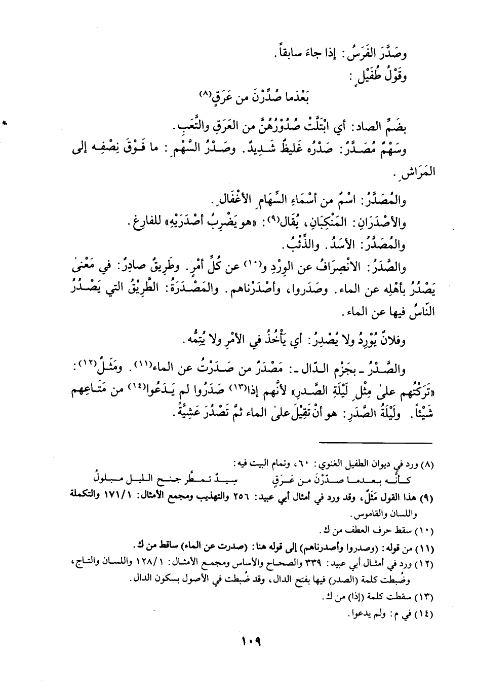 وصَدرَ الفَرَسُ : إذا جاءَ سابقاً . وقَوْلُ طُفَيْل : بَعْدَما صُدرْنَ من عَرَقٍ بضَم الصاد : أي ابْتَلتْ صُدُوْرُهُنَ من العَرَقِ والتَّعَبِ . وسَهْم مُصَدَّرٌ : صَدْرُه غَليظٌ شَدِيدٌ . وصَدْرُ السهْمِ : ما فَوْقَ نِصْفِه إلى المَرَاشَ . والمُصَدرُ : اسْمٌ من أسْمَاءِ السهَامِ الأغْفَالِ . والأصْدَرَانِ : المَنْكِبَانِ ، يُقَال : ' هو يَضْرِبُ أصْدَرَيْهِ ' للفارِغ . والمُصَدرُ : الأسَدُ . والذَئْبُ . والصدَرُ : الانْصِرَافُ عن الوِرْدِ و عن كُلِّ أمْرٍ . وطَرِيقٌ صادِرٌ : في مَعْنى يَصْدُرُ بأهْلِه عن الماء . وصَدَروا ، وأصْدَرْناهم . والمَصْدَرَةُ : الطَّرِيْقُ التي يَصْدُرُ الناسُ فيها عن الماء . وفلان يوْرِدُ ولا يُصْدِرُ : أي يَأْخُذُ في الأمْرِ ولا يُتِمه . والصدْرُ - بجَزْم الدّال - : مَصْدَرٌ من صَدَرْتُ عن الماء . ومَثَلٌ : ' تَرَكْتُهم على مِثْلِ لَيْلَةِ الصدرِ ' لأنَّهم إذا صَدَرُوا لمِ يَدَعُوا من مَتَاعِهم شَيْئاً . ولَيْلَةُ الصدَرِ : هو أنْ تَقِيْلَ على الماء ثم تَصْدُرَ عَشِيةَ .