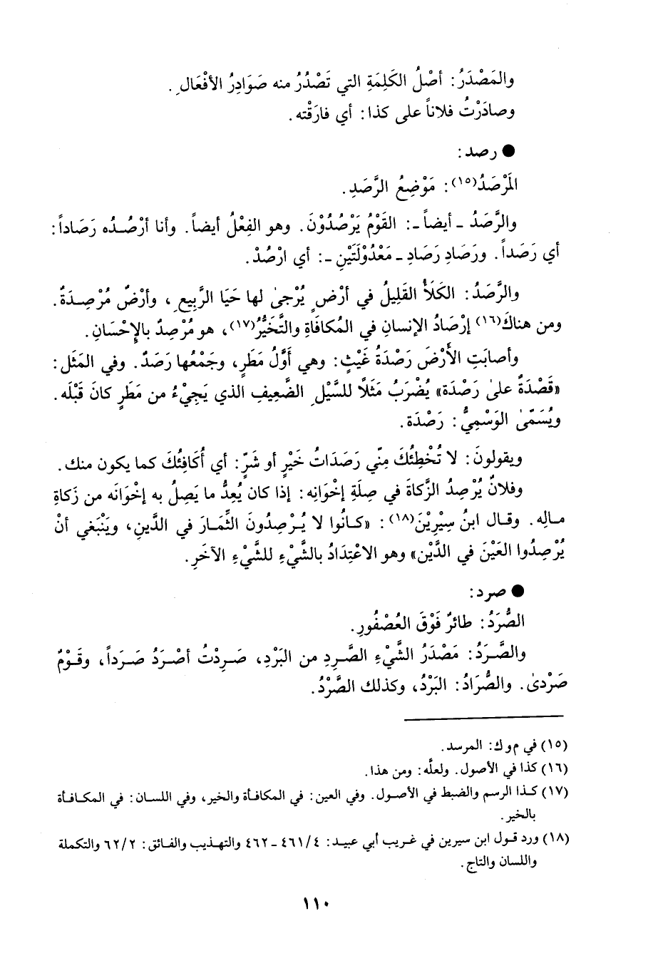 والمَصْدَرُ : أصْلُ الكَلِمَةِ التي تَصْدُرُ منه صَوَادِرُ الأفْعَالِ . وصادَرْتُ فلاناً على كذا : أي فارَقْته . رصد المَرْصَدُ : مَوْضِعُ الرصَدِ . والرصَدُ - الكلأ - : القَوْمُ يَرْصُدُوْنَ . وهو الفِعْلُ أيضاً . وأنا أرْصُدُه رَصَاداً : أي رَصَداً . ورَصَادِ رَصَادِ - مَعْدُوْلَتَيْنِ - : أي ارْصُدْ . والرصَدُ : الكَلَأ القَلِيلُ في أرْضٍ يُرْجى لها حَيَا الربِيعِ ، وأرْض مُرْصِدَة . ومن هناكَ إرْصَادُ الإنسانِ في المُكافَاةِ والتَّخَيُّرُ ، هو مُرْصِدٌ بالِإحْسَانِ . وأصابَتِ الأرْضَ رَصْدَةُ غَيْثٍ : وهي أَوَلُ مَطَرٍ ، وجَمْعُها رَصَد . وفي المَثَل : ' قَصْدَةٌ على رَصْدَة ' يُضْرَبُ مَثَلَاَ للسيْلِ الضَّعِيفِ الذي يَجِيْءُ من مَطَرٍ كانَ قَبْلَه . وُيسَمى الوَسْمِي : رَصْدَة . ويقولونَ : لا تُخْطِئُكَ مِني رَصَدَاتُ خَيْرٍ أو شَرٍّ : أي أُكَافِئُكَ كما يكون منك . وفلانٌ يُرصِدُ الزَّكاةَ في صِلَةِ إخْوَانِه : إذا كان يُعِدُّ ما يَصِلُ به إخْوَانَه من زَكاةِ مالِه . وقال ابنُ سِيْرِيْنَ : ' كانُوا لا يُرْصِدُونَ الثِّمَارَ في الدَّينِ ، وَينْبَغي أنْ يُرْصِدُوا العَيْنَ في الديْن ' وهو الاعْتِدَادُ بالشَّيْءِ للشَّيْءِ الآخَرِ . صرد الصرَدُ : طائرٌ فَوْقَ العُصْفُورِ . والصرَدُ : مَصْدَرُ الشَّيْءِ الصرِدِ من البَرْدِ ، صَرِدْتُ أصْرَدُ صَرَداً ، وقَوْمٌ صَرْدى . والصُرَادُ : البَرْدُ ، وكذلك الصَّرْدُ .