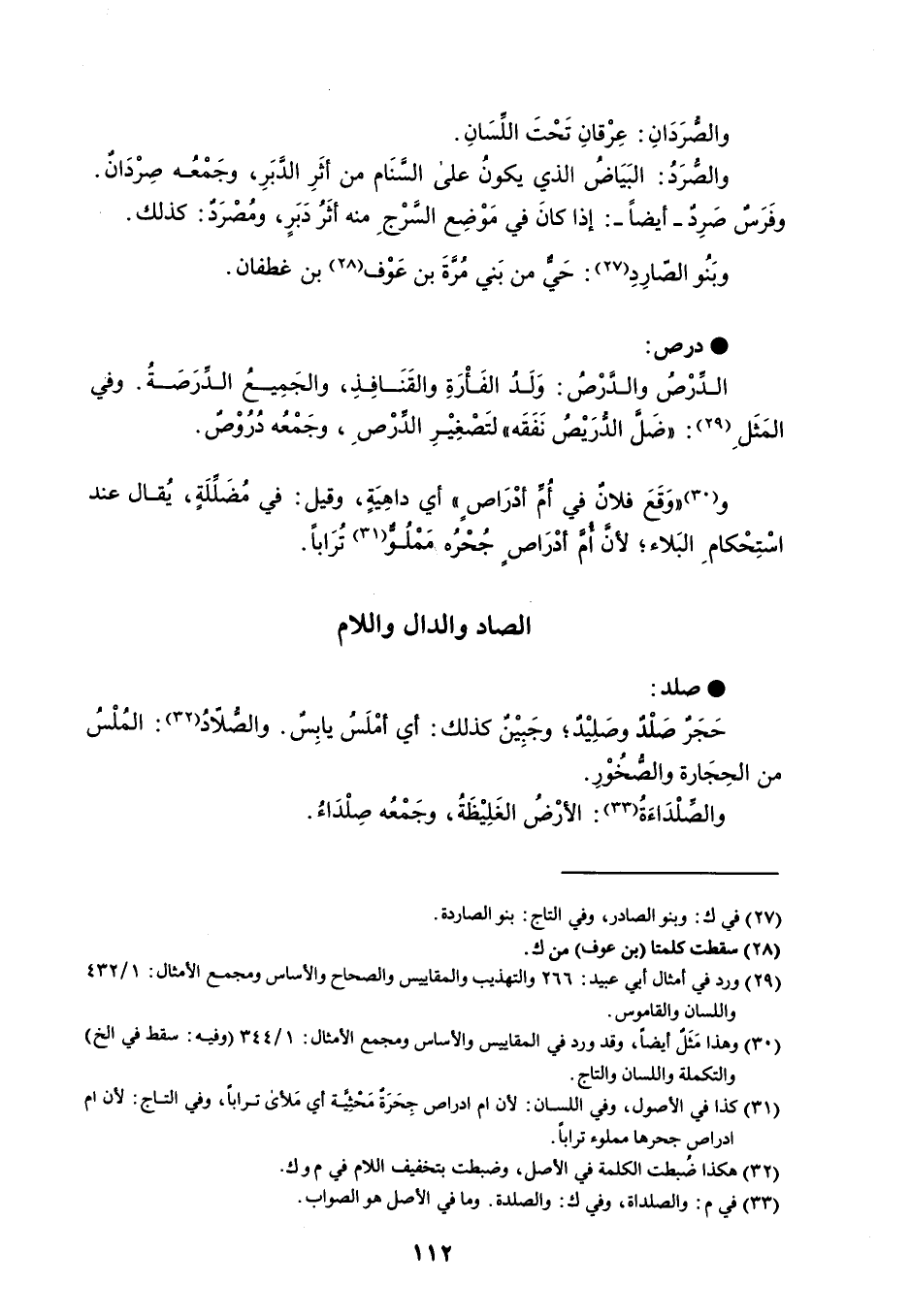 والصرَدَانِ : عِرْقانِ تَحْتَ اللسَانِ . والصرَدُ : البَيَاضُ الذي يكونُ على السَّنَام من أثَرِ الدَّبَرِ ، وجَمْعُه صِرْدَانٌ . وفَرَسٌ صَرِدٌ - أيضاً - : إذا كانَ في مَوْضِع السرْجِ منه أثَرُ دَبَرٍ ، ومُصْرَدٌ : كذلك . وبَنُو الصارِدِ : حَف من بَني مُرةَ بن عَوْف بن غطفان . درص الدرْصُ والدَّرْصُ : وَلَدُ الفَاْرَةِ والقَنَافِذِ ، والجَمِيعُ الدِّرَصَةُ . وفي المَثَلِ : ' ضَل الدرَيْصُ نَفَقَه ' لتَصْغِيْرِ الدِّرْصِ ، وجَمْعُه دُرُوْص . و ' وَقَعَ فلانٌ في أُمِّ أدْرَاصٍ ' أي داهِيَةٍ ، وقيل : في مُضلَلَةٍ ، يُقال عند اسْتِحْكامِ البَلاء ؛ لأن أم أدْرَاصٍ جُحْرُه مَمْلُو تُرَاباً .