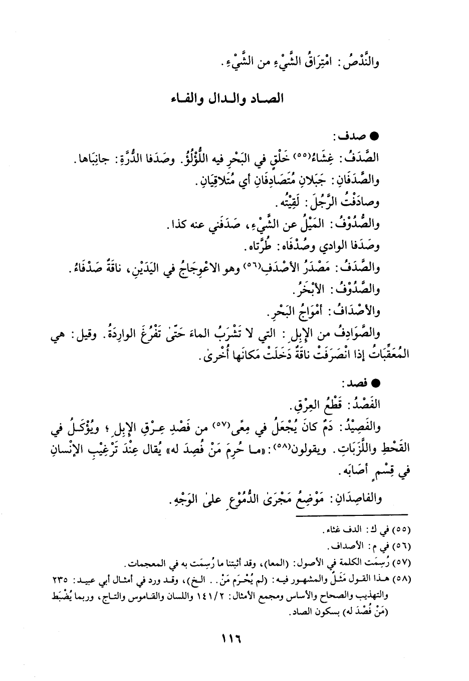 صدف الصدَفُ : غِشَاءُ خَلْق في البَحْرِ فيه اللًّؤْلُؤُ . وصَدَفا الدُّرةِ : جانِبَاها . والصدَفَانِ : جَبَلانِ مُتَصَادِفَانِ أي مُتَلاقِيَانِ . وصادَفْتُ الرَّجُلَ : لَقِيْتُه . والصُدُوْفُ : المَيْلُ عن الشَّيْءِ ، صَدَفَني عنه كذا . وصَدَفا الوادي وصُدْفَاه : طُرتاه . والصَّدَفُ : مَصْدَرُ الأصْدَفِ وهو الاعْوِجَاجُ في اليَدَيْنِ ، ناقَةٌ صَدْفَاءُ . والصدُوْفُ : الأبْخَرُ . والأصْدَافُ : أمْوَاجُ البَحْرِ . والصَّوَادِفُ من الإبِل : التي لا تَشْرَبُ الماءَ حَتّى تَفْرُغَ الوارِدَةُ . وقيل : هي المُعَقِّبَاتُ إذا انْصَرَفَتْ ناقَة دَخَلَتْ مَكانَها أُخْرى . فصد الفَصْدُ : قَطْعُ العِرْقِ . والفَصِيْدُ : دَمٌ كانَ يُجْعَلُ في مِعًى من فَصْدِ عِرْقِ الِإبِلِ ؛ ويؤْكَلُ في القَحْطِ واللَزَبَاتِ . ويقولون : ' ما حُرِمَ مَنْ فُصِدَ له ' يُقال عِنْدَ تَرْغِيْبِ الإنْسانِ في قِسْمٍ أصَابَه . والفاصِدَانِ : مَوْضِعُ مَجْرَى الدمُوْعِ على الوَجْهِ .