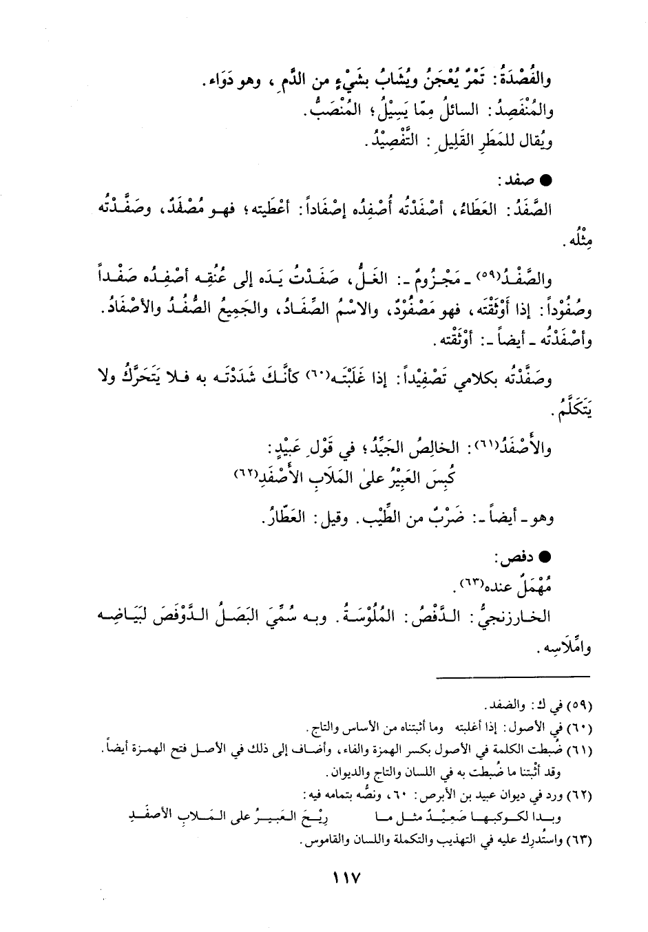 والفُصْدَةُ : تَمْر يُعْجَنُ وُيشَابُ بشَيءٍ من الدمِ ، وهو دَوَاء . والمُنْفَصِد : السائلُ مِمّا يَسِيْلُ ؛ المُنْصَبُّ . وُيقال للمَطَرِ القَلِيلِ : التَّفْصِيْدُ . صفد الصفَدُ : العَطَاءُ ، أصْفَدْتُه أُصْفِدُه إصْفَاداً : أعْطَيته ؛ فهو مُصْفَدٌ ، وصَفَدْتُه مِثْلُه . والصفْدُ - مَجْزُومٌ - : الغَلُّ ، صَفَدْتُ يَدَه إلى عُنُقِه أصْفِدُه صَفْداً وصُفُوْداً : إذا أَوْثَقْتَه ، فهو مَصْفُوْدٌ ، والاسْمُ الصفَادُ ، والجَمِيعُ الصُّفُدُ والأصْفَادُ . وأصْفَدْتُه - أيضاً - : أوْثَقْته . وصَفَدْتُه بكلامي تَصْفِيْداً : إذا غَلَبْتَه كأنَّكَ شَدَدْتَه به فلا يَتَحَركُ ولا يتكلم . والأصْفَدُ : الخالِصُ الجَيدُ ؛ في قَوْلِ عَبيْدٍ : كُبِسَ العَبِيْرُ على المَلاَبِ الأصْفَدِ وهو - أيضاً - : ضَرْبٌ من الطيْب . وقيل : العَطّارُ . دفص مُهْمَلٌ عنده . الخارزنجيُ : الدفْصُ : المُلُوْسَةُ . وبه سُمِّيَ البَصَلُ الدوْفَصَ لبَيَاضِه وأملاسه .