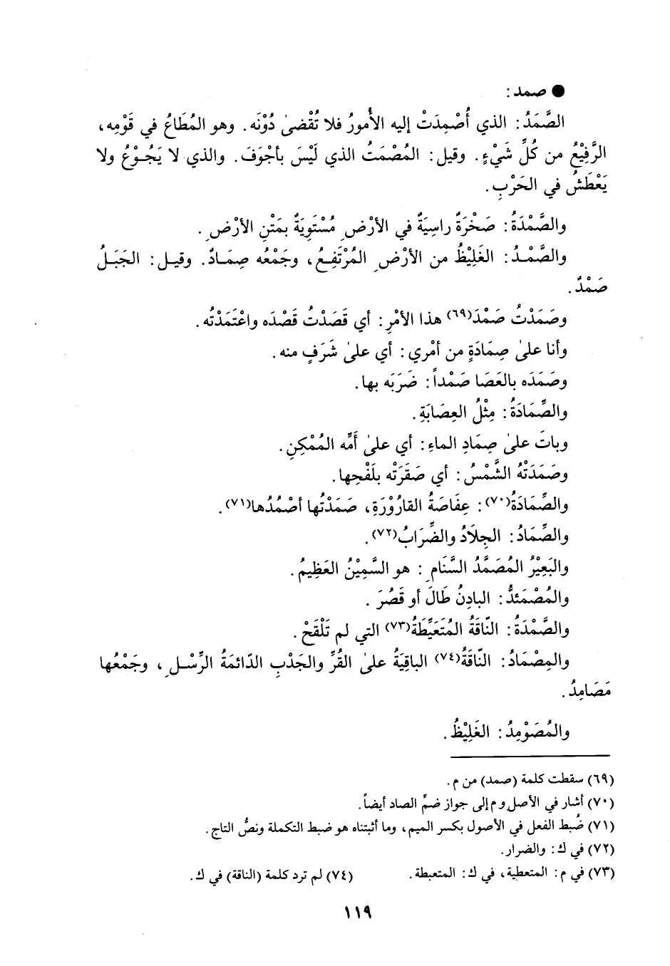 صمد الصمَدُ : الذي أُصْمِدَتْ إليه الأمورُ فلا تُقْضى دُوْنَه . وهو المُطَاعُ في قَوْمِه ، الرفِيْعُ من كُلِّ شَيْءٍ . وقيل : المُصْمَتُ الذي لَيْسَ بأجْوَفَ . والذي لا يَجُوْعُ ولا يَعْطَشُ في الحَرْبِ . والصمْدَةُ : صَخْرَةٌ راسِيَةٌ في الأرْضِ مُسْتَوِيَةٌ بمَتْنِ الأرْضِ . والصمْدُ : الغَلِيْظُ من الأرْضِ المُرْتَفِعُ ، وجَمْعُه صِمَادٌ . وقيل : الجَبَلُ صمْدٌ . وصَمَدْتُ صَمْدَ هذا الأمْرِ : أي قَصَدْتُ قَصْدَه واعْتَمَدْتُه . وأنا على صِمَادَة من أمْري : أي على شَرَفٍ منه . وصَمَدَه بالعَصَا صَمْداً : ضَرَبَه بها . والصِّمَادَة : مِثْلُ العِصَابَةِ . وباتَ على صِمَادِ الماءِ : أي على أَمَه المُمْكِنِ . وصمَدَتْهُ الشمْسُ : أي صَقَرَتْه بلَفْحِها . والصمَادَةُ : عِفَاصَةُ القارُوْرَةِ ، صَمَدْتُها أصْمُدُها . والصمَادُ : الجِلاَدُ والضِّرَابُ . والبَعِيْرُ المُصَمَّدُ السَّنَام : هو السَّمِيْنُ العَظِيمُ . والمُصْمَئد : البادِنُ طَال أو قَصُرَ . والصَّمْدَةُ : النّاقَةُ المُتَعَيِّطَةُ التي لم تَلْقَحْ . والمِصْمَادُ : النّاقَةُ الباقِيَةُ على القُرِّ والجَدْبِ الدّائمَةُ الرِّسْلِ ، وجَمْعُها مَصَامِدُ . والمُصَوْمِدُ : الغَلِيْظُ .