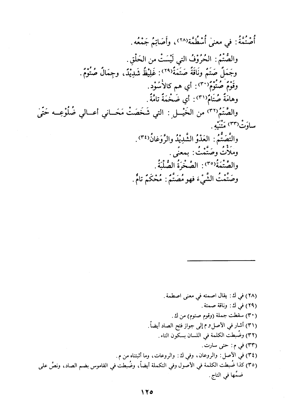 أُصْتُمةُ : في معنى أُسْطُمة ، وأَصَاتِمُ جَمعه . والصُّتْمُ : الحُرُوْفُ التي لَيْسَتْ من الحَلْقِ . وجَملٌ صَتَم ونَاقَةٌ صتَمَة : غَلِيْظٌ شَدِيْدٌ ، وجِمَالٌ صُتُوْمٌ . وقَوْمٌ صُتُوْمُ : أي همِ كالأسُوْد . وهامَةُ صُتَام : أي ضخْمَة تامةٌ . والصَّتَمِ من الخَيْلِ : التي شَخَصَتْ مَحَاني أعالي ضُلُوْعِه حَتّى ساوَتْ مَتْنيْهِ . والتصَتُّمُ : العَدْوُ الشَدِيْدُ والروَغانُ . وملَأْتُ وصَتَّمْتُ : بمعنى . والصَّتْمَةُ : الصخْرَةُ الصُّلْبَةُ . وصَتمْتُ الشيْءَ فهو مُصَتَّمٌ : مُحْكَمٌ تامٌّ .