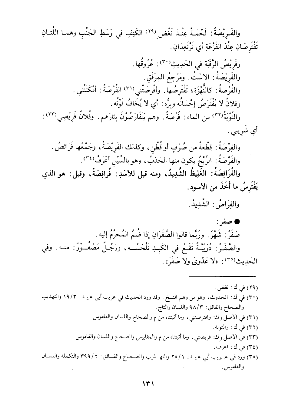 والفَرِيْصَةُ : لَحْمَةٌ عِنْدَ نَغْضِ الكَتِفِ في وَسَطِ الجَنْبِ وهما اللَّتانِ تَفْتَرِصَانِ عِنْدَ الفَزْعَةِ أي تَرْتَعِدَانِ . وفَرِيْصُ الرَّقَبَة في الحَدِيثِ : عُرُوقُها . والفَرِيْصَةُ : الاست . ومَرْجِعُ المِرْفَقِ . والفُيْرصَةُ : كالنُّهْزَة ؛ تَفْتَرِصُها . وأفْرَصَتْني الفُرْصةُ : أمْكَنَتْني . وفلان لا يُفْتَرَصُ إحْسَانُه وبِرُه : أي لا يُخَافُ فَوته . والنَّوْبَةُ من الماء : فُرْصَةٌ . وهم يَتَفَارَصُوْنَ بِئارَهم . وفُلانٌ فَرِيْصِي : أي شَرِيبي . والفِرْصَةُ : قِطْعَة من صُوْفٍ أو قُطْنٍ ، وكذلك الفَرِيْصَةُ ، وجَمْعُها فَرَائصُ . والفَرْصَةُ : الريْحُ يكون منها الحَدَبُ ، وهو بالسِّيْنِ أعْرَفُ . والفُرَافِصَةُ : الغَلِيظُ الشدِيدُ ، ومنه قيل للأسَدِ : فُرافِصَةُ ، وقيل : هو الذي يَفْتَرِسُ ما أَخَذَ من الأسود . والفِرَاصُ : الشدِيدُ . صفر صَفَرٌ : شَهْرٌ . ورُبَّما قالوا الصَّفَرَانِ إذا ضُمَّ المحرمُ إليه . والصفَرُ : دُويبَّةٌ تَقَعُ في الكَبِدِ تَلْحَسُه ، ورَجُل مَصْفُوْر : منه . وفي الحَدِيث : ' لا عَدْوى ولا صَفَرَ ' .