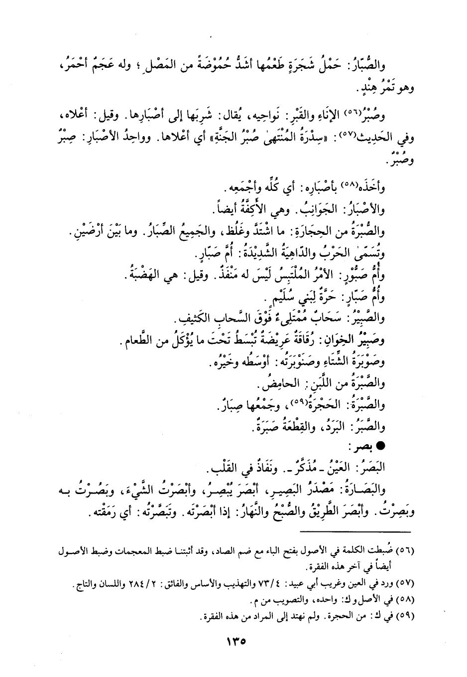 والصُّبّارُ : حَمْلُ شَجَرَةٍ طَعْمُها أشَد حُمُوْضَةً من المَصْلِ ؛ وله عَجَمٌ أحْمَرُ ، وهو تَمْرُ هِنْدٍ . وصُبْرُ الإنَاءِ والقَبْرِ : نَواحِيه ، يُقال : شَرِبَها إلى أصْبَارِها . وقيل : أعْلاه ، وفي الحَدِيث : ' سِدْرَةُ المُنْتَهى صُبْرُ الجَنَّةِ ' أي أعْلاها . وواحِدُ الأصبَارِ : صِبْرٌ وصبر . وأخَذَه بأصْبَارِه : أي كُله وأجْمَعِه . والأصْبَارُ : الجَوَانِبُ . وهي الأكِفَّةُ أيضاً . والصُّبْرَةُ من الحِجَارَةِ : ما اشْتَد وغَلُظ ، والجَمِيعُ الصِّبَارُ . وما بَيْنَ أرْضَيْنِ . وتُسَمى الحَرْبُ والدّاهِيَةُ الشَدِيْدَةُ : أمَّ صَبّارٍ . وأم صَبُوْرٍ : الأمْرُ المُلْتَبِسُ لَيْسَ له مَنْفَذٌ . وقيل : هي الهَضْبَةُ . وأمُ صَبارٍ : حَرَّةٌ لِبَني سُلَيْمٍ . والصَّبِيْرُ : سَحَابٌ مُمْتَلِىء فَوْقَ السَّحابِ الكَثيفِ . وصَبِيرُ الخِوَانِ : رُقَاقَة عَرِيْضَةٌ تُبْسَطُ تَحْتَ ما يُؤْكَلُ من الطَعام . وصَوْبَرَةُ الشتَاءِ وصَنَوْبَرَتُه : أوْسَطُه وخَيْرُه . والصبْرَةُ من اللَّبَنِ : الحامض . والصبْرَةُ : الحَجْرَةُ ، وجَمْعُها صِبَارٌ . والصبَرُ : البَرَدُ ، والقِطْعَةُ صَبَرَةٌ . بصر البَصَرُ : العَيْنُ - مُذَكَّرٌ - . ونَفَاذٌ في القَلْب . والبَصَارَةُ : مَصْدَرُ البَصِيرِ ، أبْصَرَ يُبْصِرُ ، وأبْصَرْتُ الشَّيْءَ ، وبَصُرْتُ به وبَصِرْتُ . وأبْصَرَ الطَّرِيْقُ والصُّبْحُ والنَهَارُ : إذا أبْصَرْتَه . وتَبَصرْتُه : أي رَمَقْته .