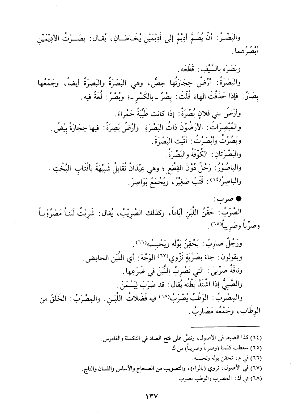 والبَصْرُ : أنْ يضَمَّ أدِيْمٌ إلى أَدِيْمَيْنِ يُخَاطانِ ، يُقال : بَصَرْتُ الأدِيْمَيْنِ أبْصُرُهما . وبَصَرَه بالسيْفِ : قَطَعَه . والبَصْرَة : أرْض حِجَارَتُها جص ، وهي البَصَرَةُ والبَصِرَةُ أيضاً ، وجَمْعُها بِصَار . فإذا حَذَفْتَ الهاءَ قُلْتَ : بِصْر - بالكَسْرِ - ؛ وبُصْرٌ : لُغَةٌ فيه . وأرْضُ بني فلانٍ بُصْرَةٌ : إذا كانت طَيبَةً حَمْراءَ . والمبصِرَاتُ : الأرَضُوْنَ ذاتُ البَصْرَةِ . وأرْض بَصِرَة : فيها حِجَارَةٌ بِيْضٌ . وبَصرْتُ وأبْصَرْتُ : أتَيْت البَصْرَةَ . والبَصْرَتانِ : الكُوْفَةُ والبَصْرَةُ . والباصُوْرُ : رَحْلٌ دُوْنَ القِطْع ؛ وهي عِيْدَانٌ تُقَابَل شَبِيْهَة بأقْتَابِ البُخْتِ . والباصِرُ : قَتَب صَغِيْر ، ويُجْمَعُ بَوَاصِرَ . صرب الصرْبُ : حَقْنُ اللَّبَنِ أيّاماً ، وكذلك الصرِيْبُ ، يقال : شَرِبْتُ لَبَناً مَصْروْباً وصَرْباً وصَرِيباً . ورَجُل صارِب : يَحْقِنُ بَوْلَه ويَحْبسُه . ويقولون : جاءَ بصَرْبَةٍ تَزْوي الوَجْهَ : أي اللَّبَن الحامِض . وناقَة صَرْبى : التي تَصرِبُ اللَّبَنَ في ضَرْعِها . والصبِيُ إذا اشْتَد بَطْنُه يُقال : قد صَرَبَ لِيَسْمَنَ . والمِصْرَب : الوَطْبُ يُصْرَبُ فيه فَضَلاتُ اللَبَنِ . والمِصْرَبُ : الخَلَقُ من الوِطَاب ، وجَمْعُه مَصَارِبُ .